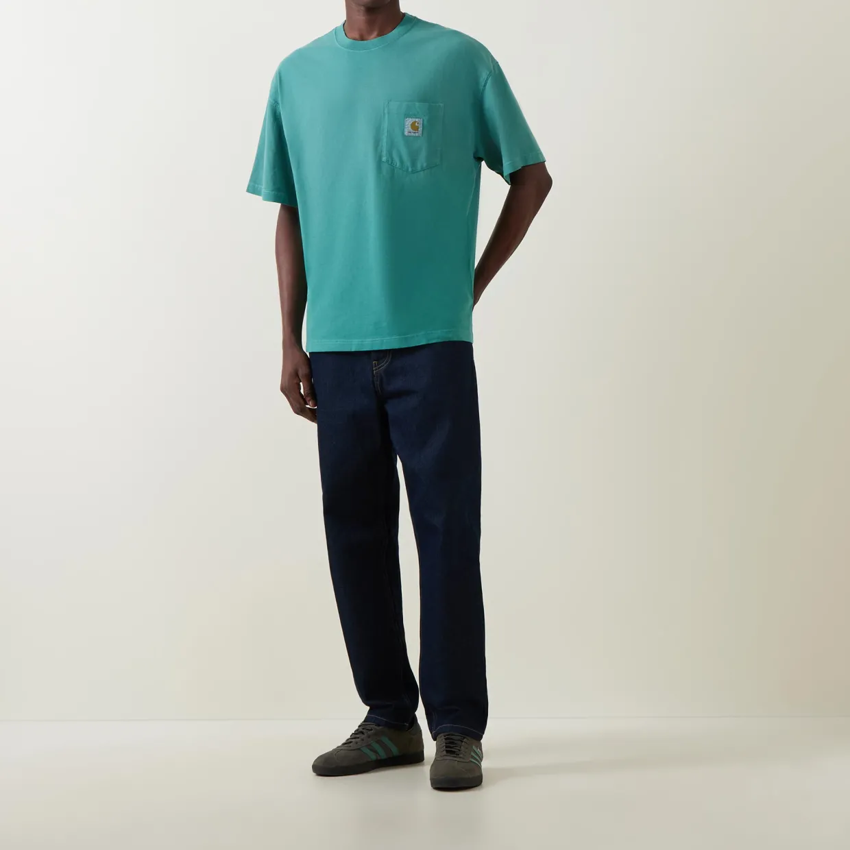 - Crew neckline, short sleeves, dropped shoulders, chest patch pocket with square logo patch, tonal stitching, straight hemline, smooth fabric