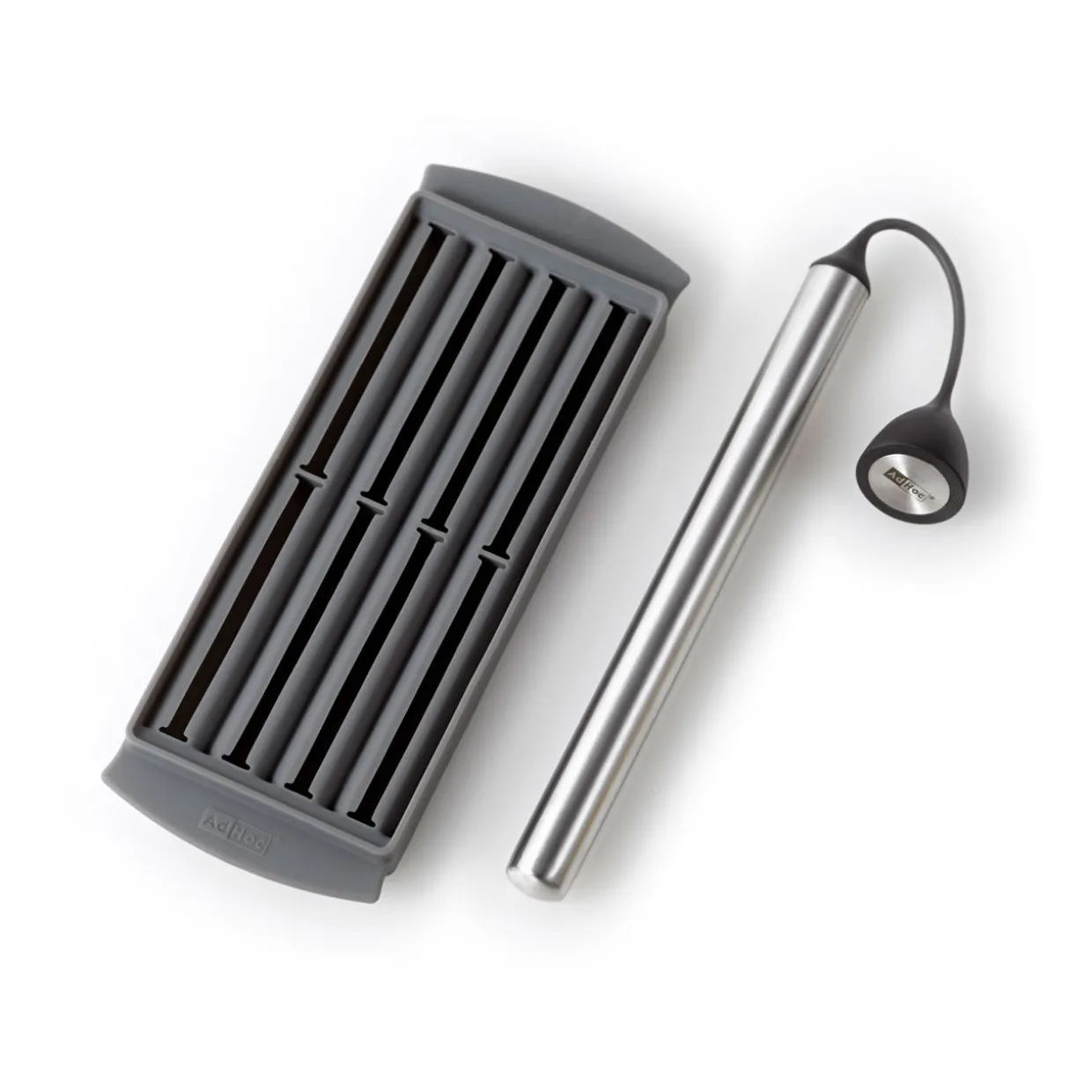 If you do not have the time to cool a bottle in the fridge, just use the Cooling Rod Ice bar. The rod is made of stainless steel and silicone; it is filled with ice sticks that have been frozen in advance in the silicone mould. Next, hang the Ice bar in the bottle and seal it with the attached silicone stopper. Resulting in a chilled drink that has not been diluted with water. The Ice bar Cooling Set includes: a refillable Stainless Steel Cooling rod, Silicone bottle stopper and Silicone mould Ice stick freezer tray. Ice bar cools the liquid from the inside versus other options of cooling from the outside take longer. The refillable cooling rod Ice bar fits into all standard beverage bottles – it features an integrated stopper that can remain in the bottle while pouring wine. The Ice bar comes with an Ice stick tray allowing it to be refilled immediately once the ice has melted.