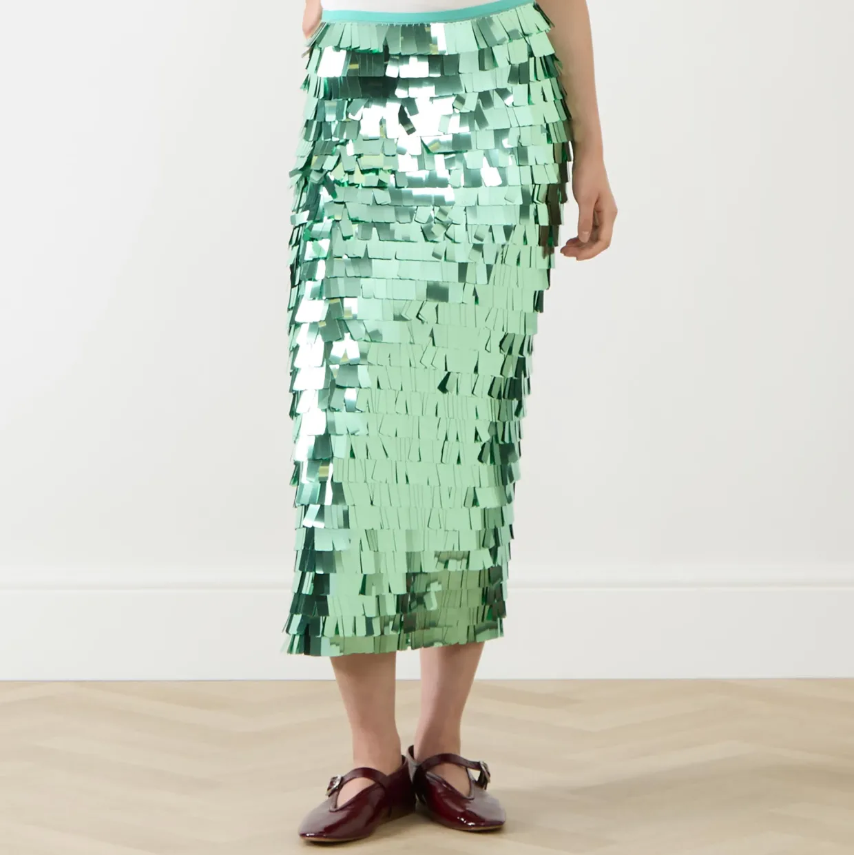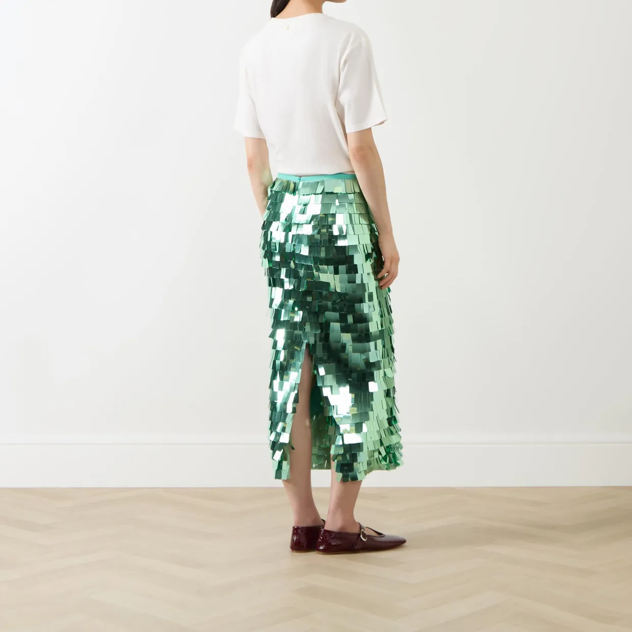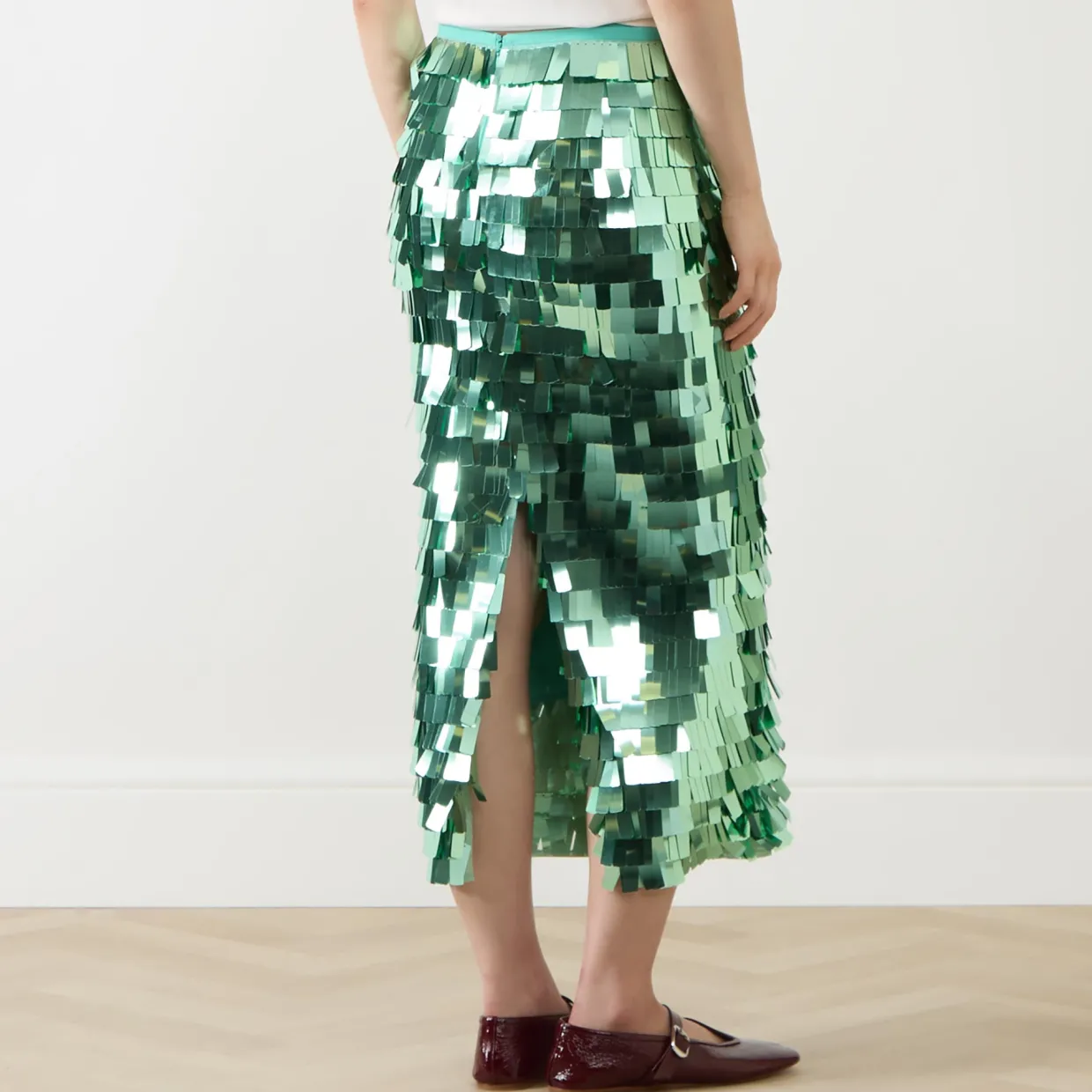 - Midi length, sequin embellishment, concealed zip fastening, slit detail to the back, lined, midweight non-stretchy fabric, pencil-style silhouette