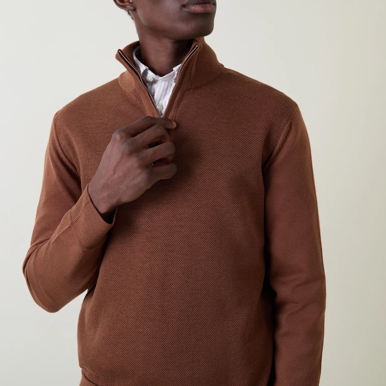 - Half-zip fastening, long sleeves, ribbed trims, straight hemline, funnel neckline