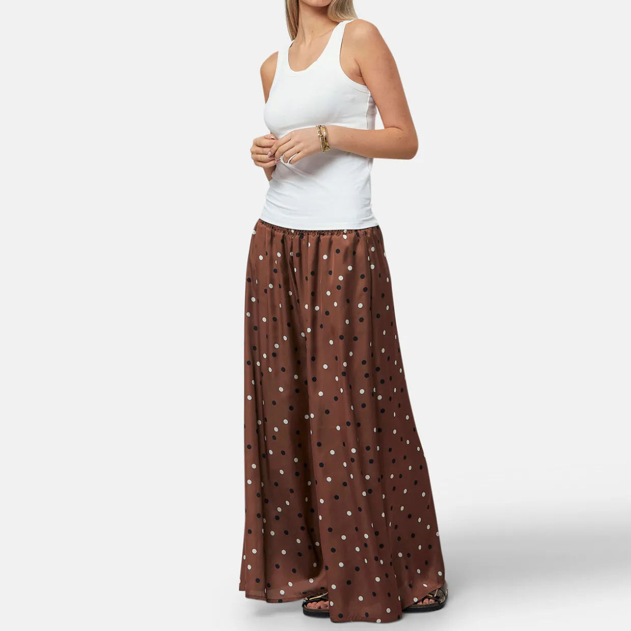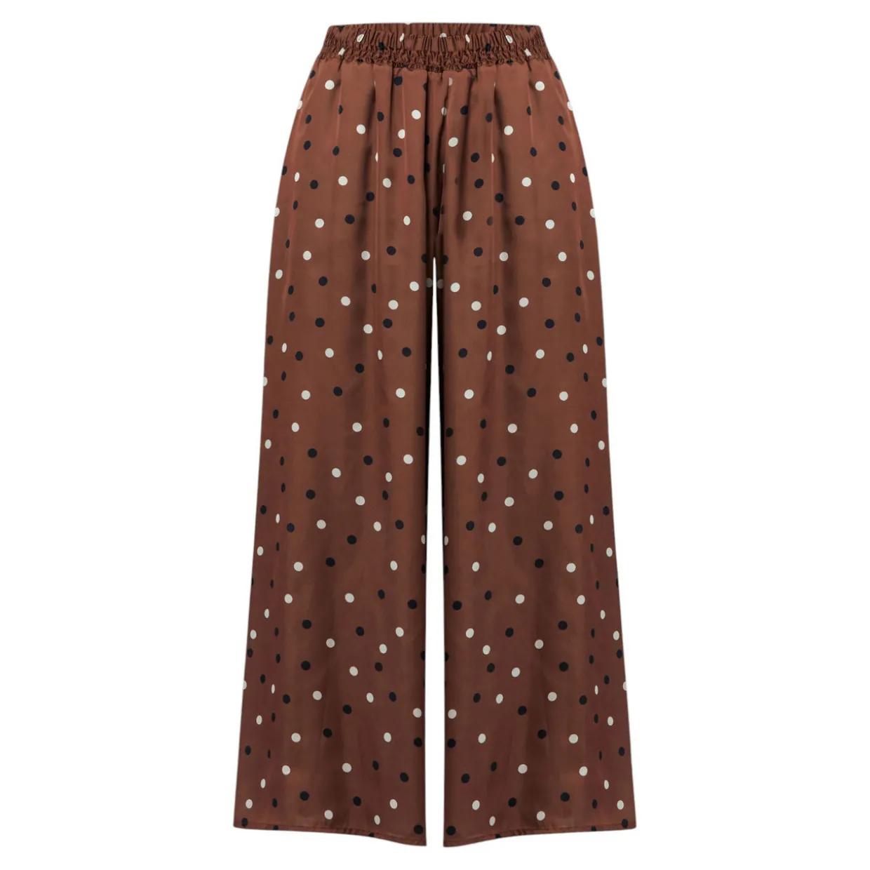 - Wide leg silhouette, polka dot print, elasticated gathered waistband, side pockets