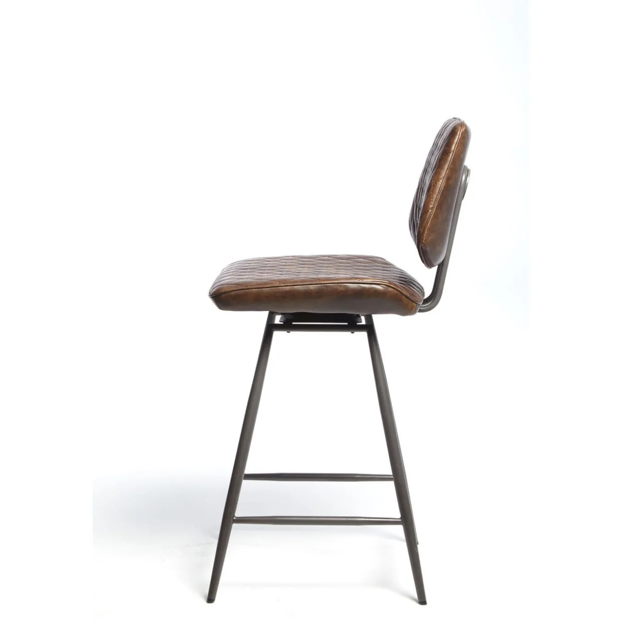 The Isabella range of dining chairs and counter stools offers a modern industrial look while maintaining durability through protected leather, making it ideal for long-term use. The stylish counter-height chair features a 66cm seat height and a 180° oscillating swivel, adding convenience to its sleek design. With an all-over quilted pattern and a striking back detail, the chair sits atop tapered black powder-coated metal legs with a footrest for added comfort.
