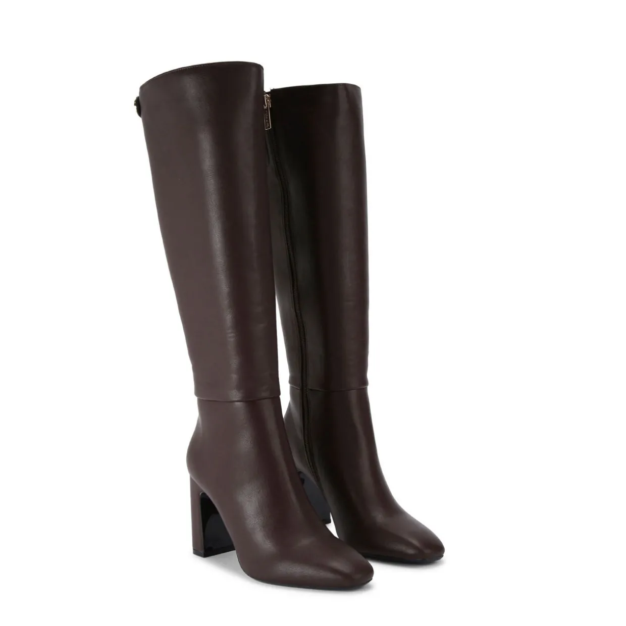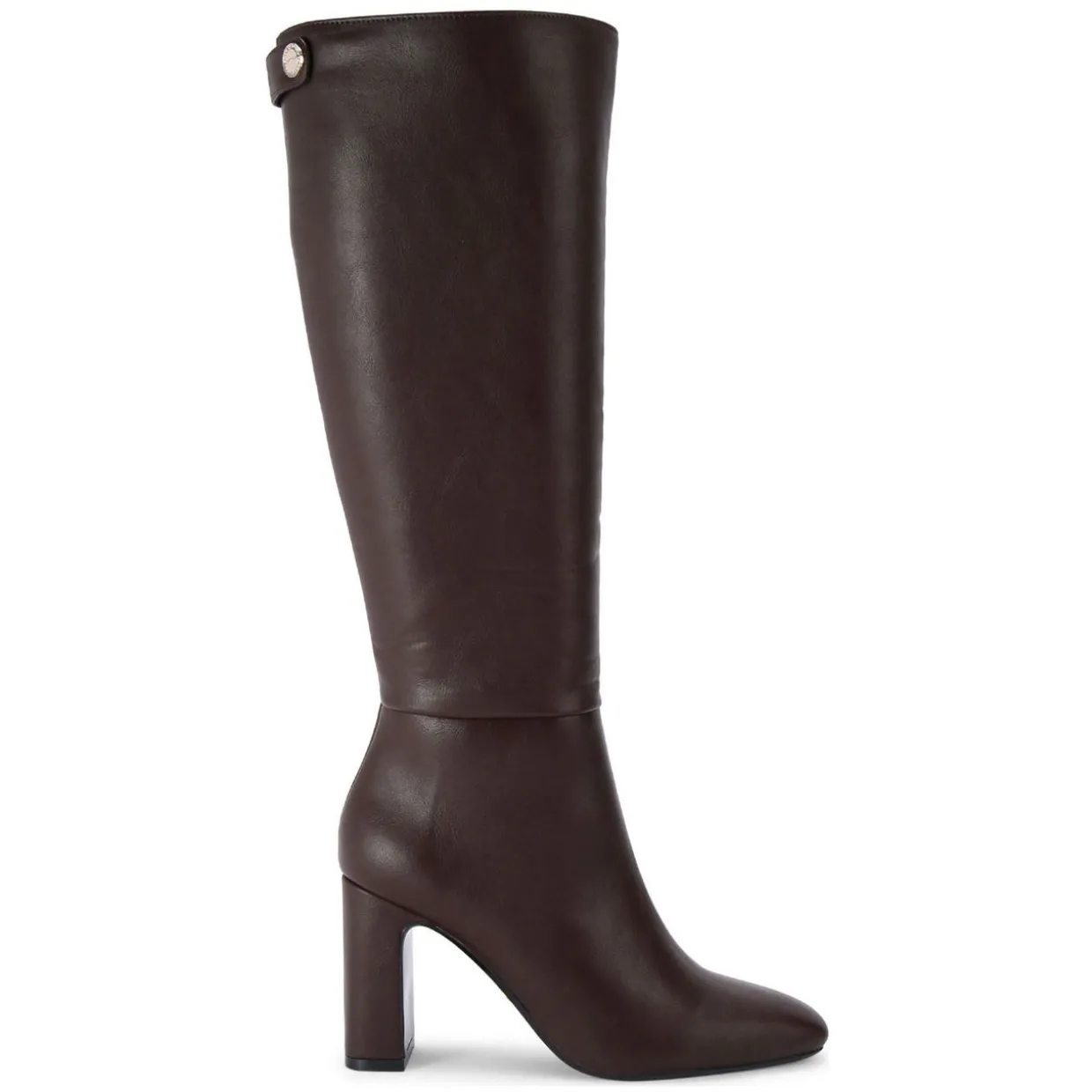 - Knee-high style, strap detail, gold-tone pin stud with crystal embellishment, block heel, side zip fastening