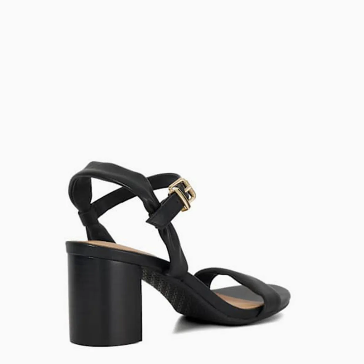 - Open-toe design, almond-shaped toe, adjustable ankle strap, gold-tone buckle fastening, sturdy stacked block heel