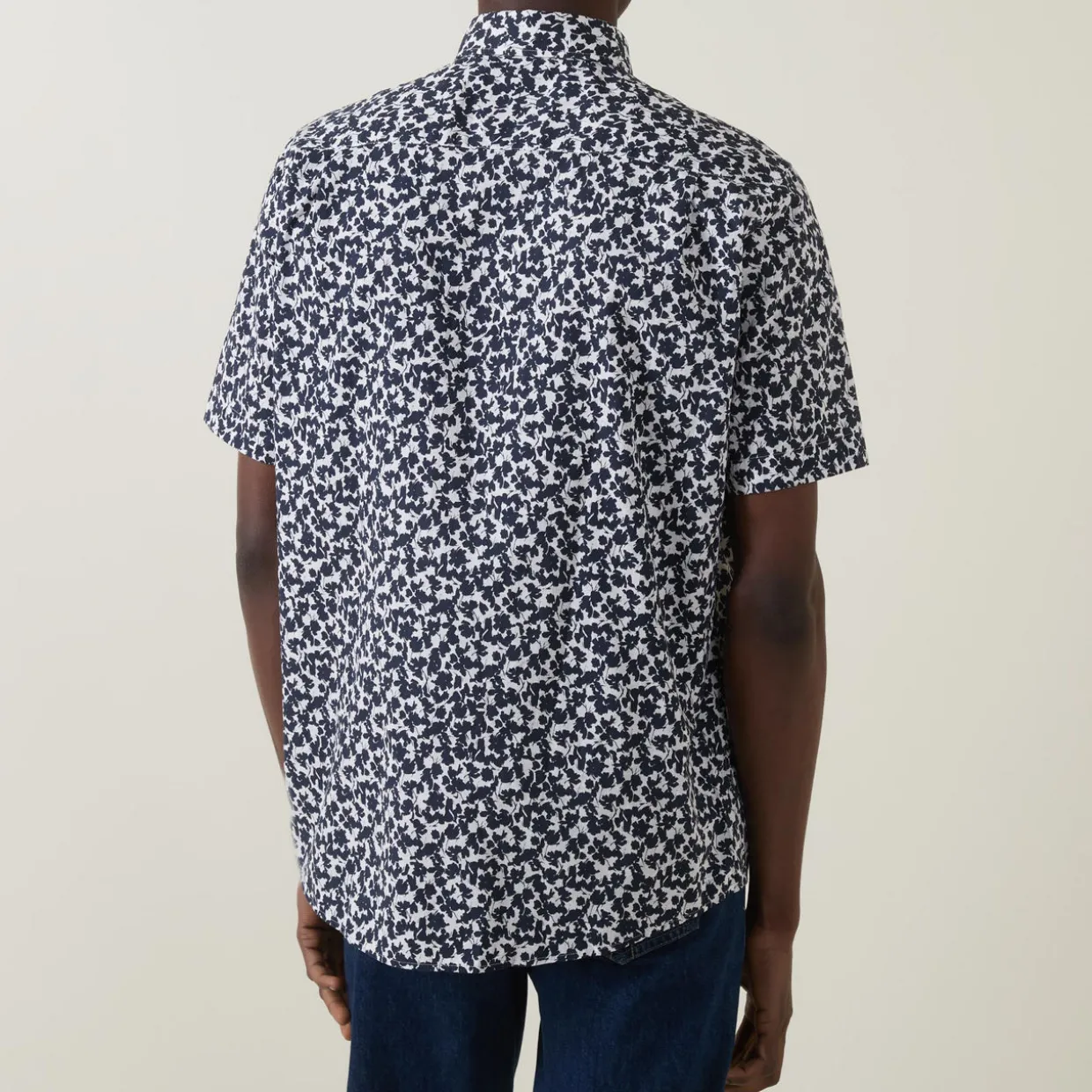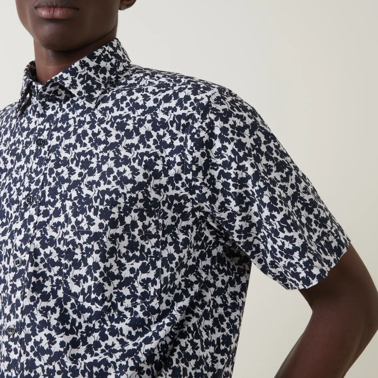- Point collar, short sleeves, one chest patch pocket, front button fastening, curved hem, floral printed pattern, two-tone finish
