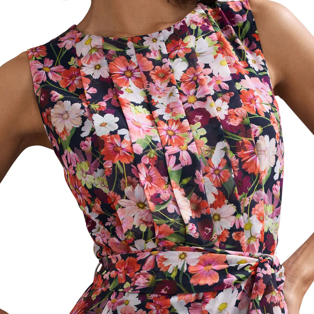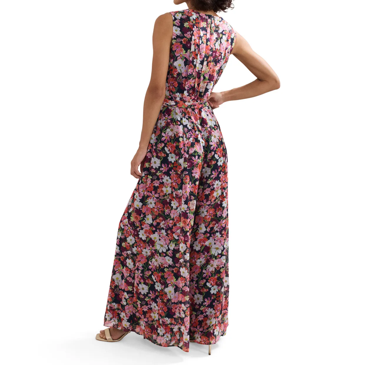 - Florals print, wide-leg silhouette, tie waist, concealed zip fastening, sleeveless