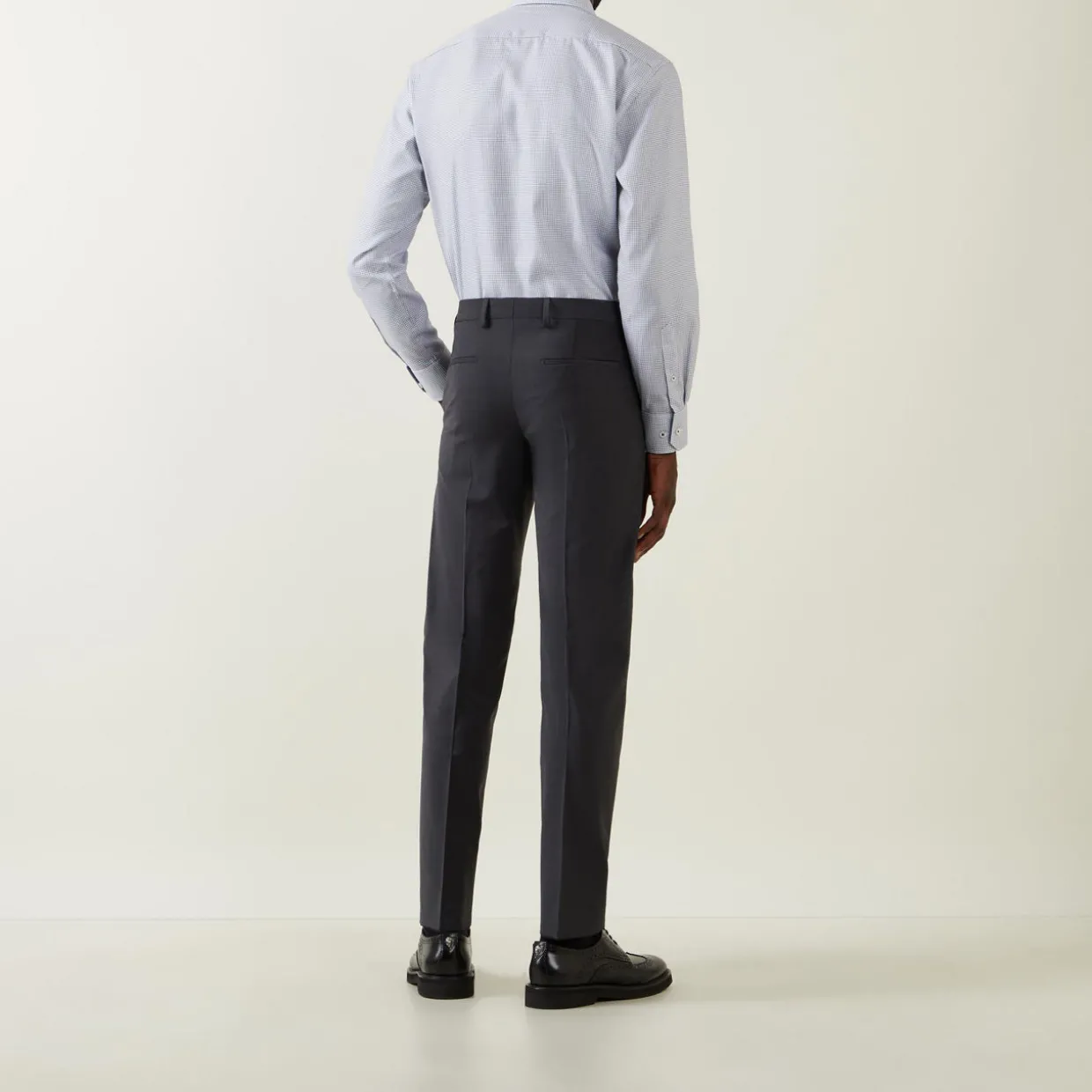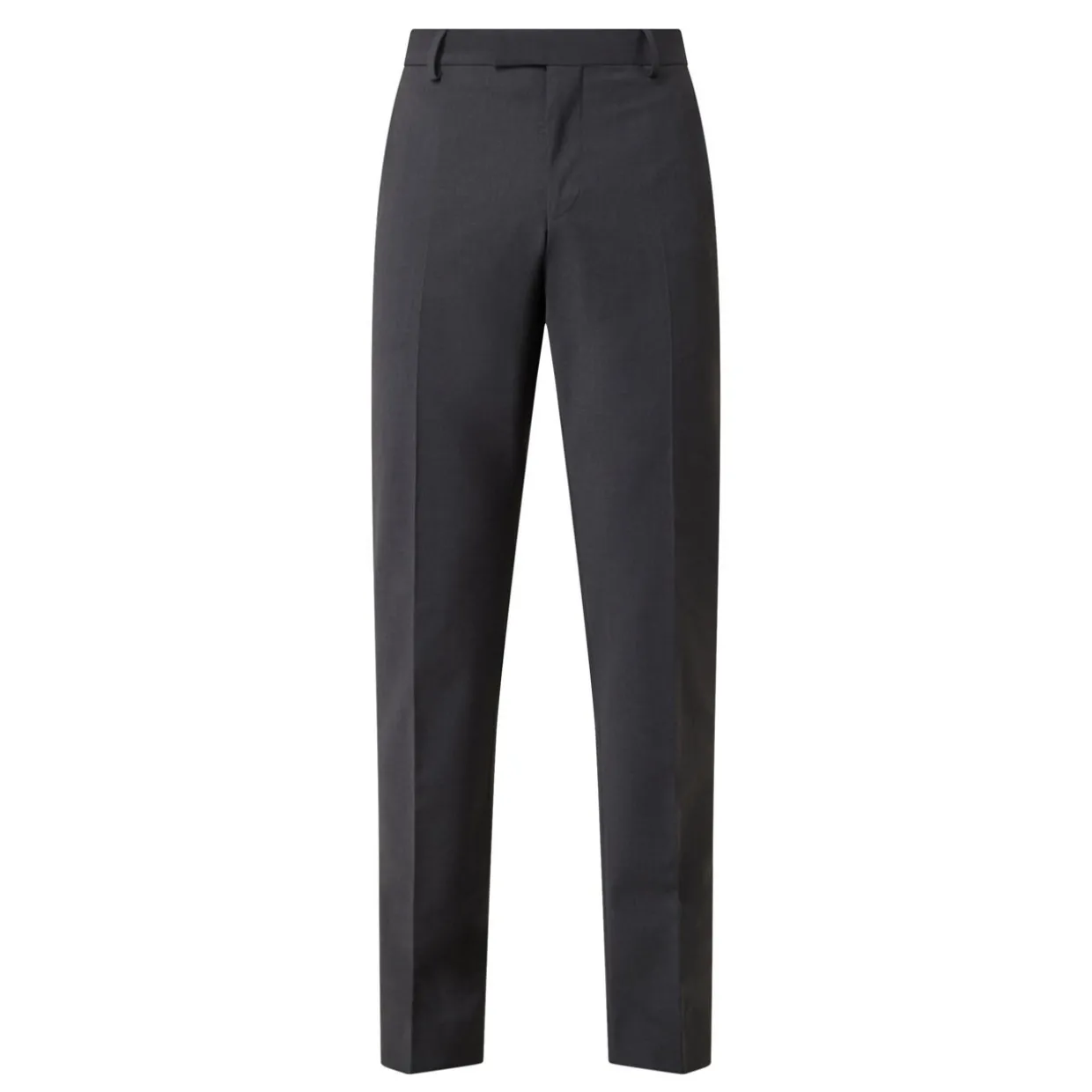 - Concealed zip-fly and button fastening, belt loops, four-pocket design, pressed creases, smooth fabric