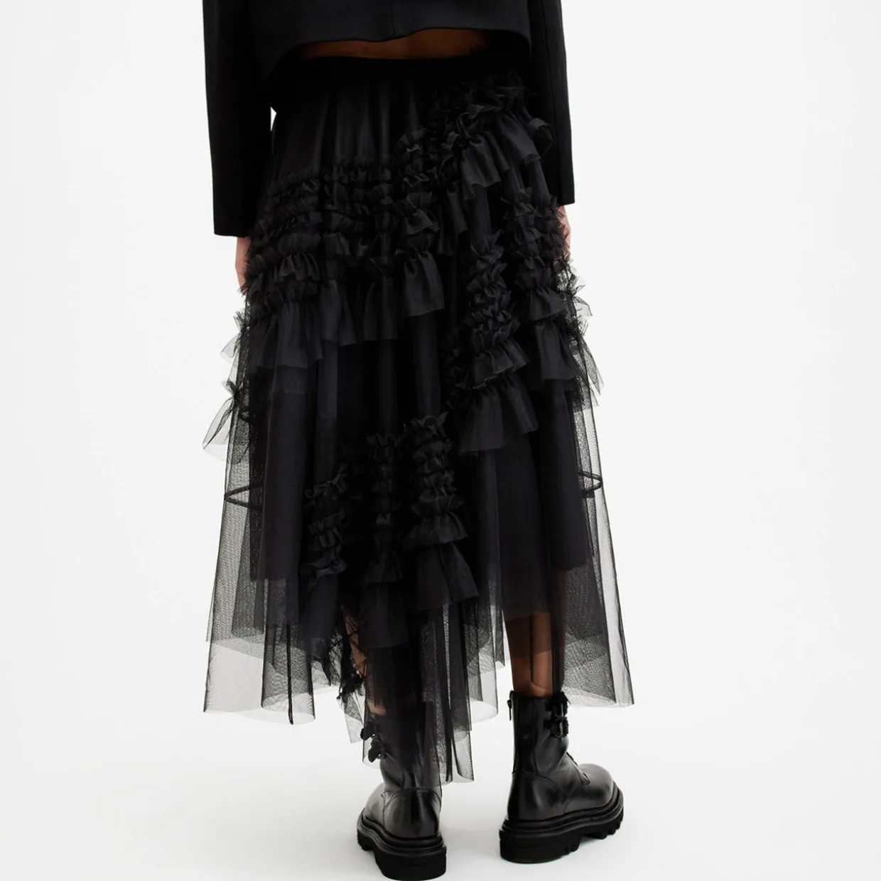 - Asymmetrical hemline, midi length, tulle design, ruffle detailing