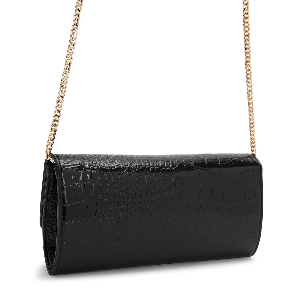 - Flap front with branded plate, chain strap, gold-tone hardware, patent croc-embossed finish