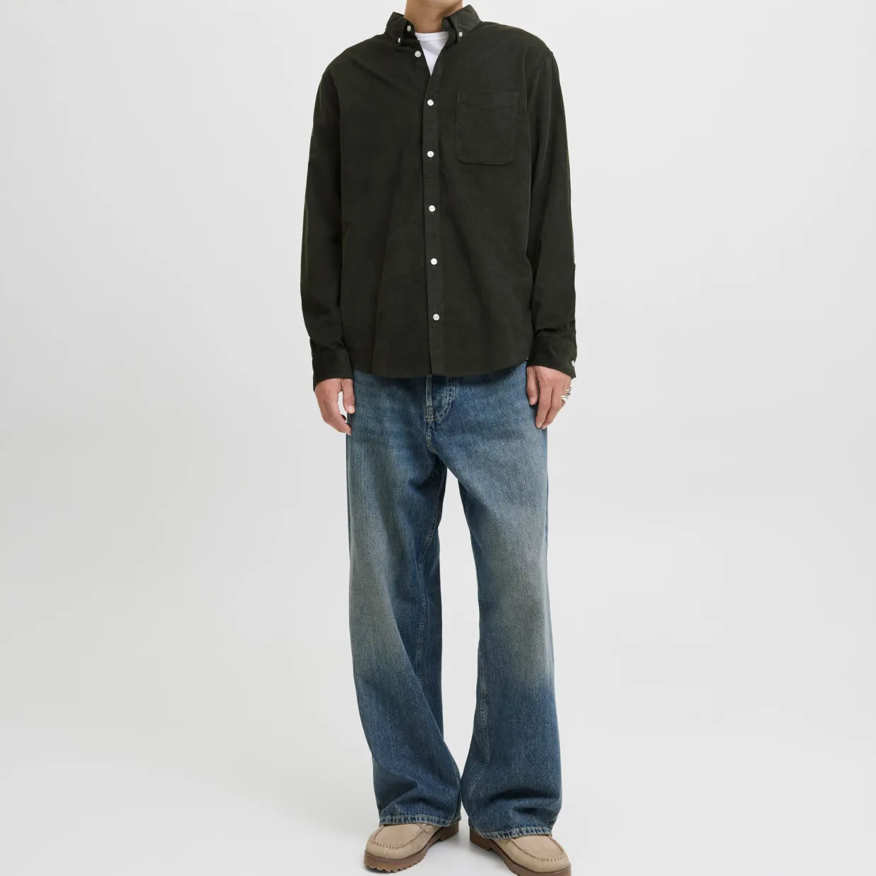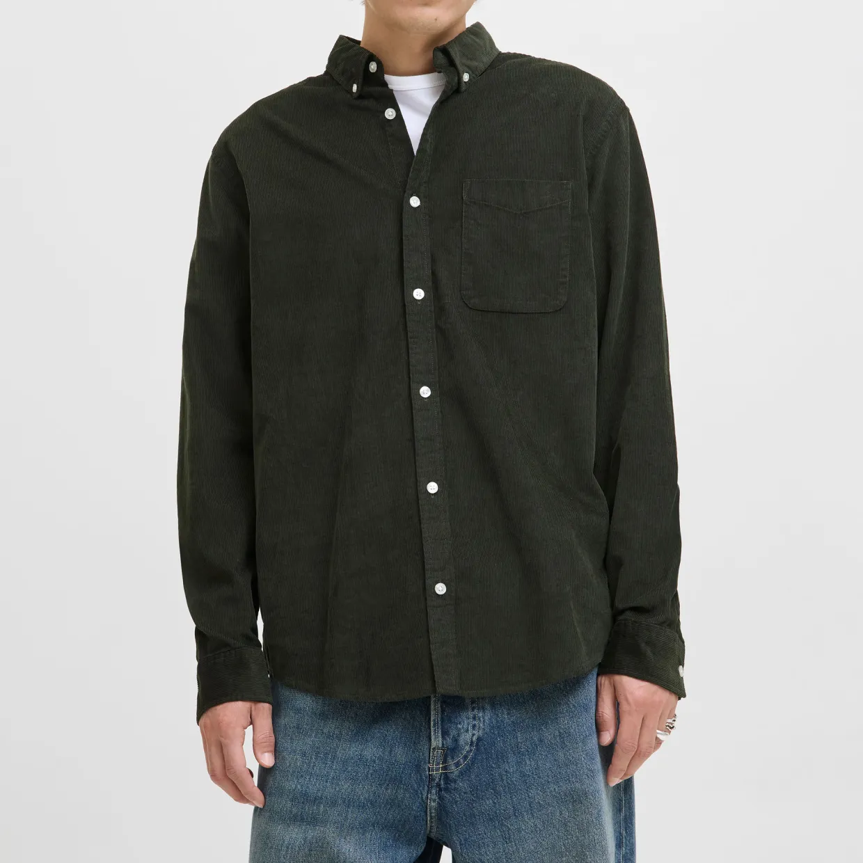 - Button-down point collar, long sleeves, buttoned cuffs, front button fastening, one chest patch pocket, curved hem, corduroy finish