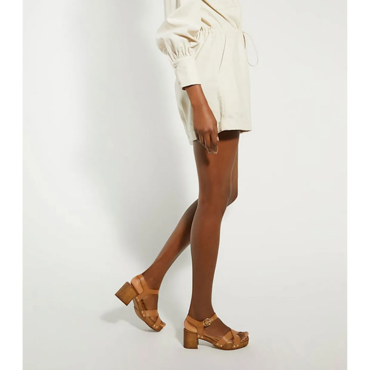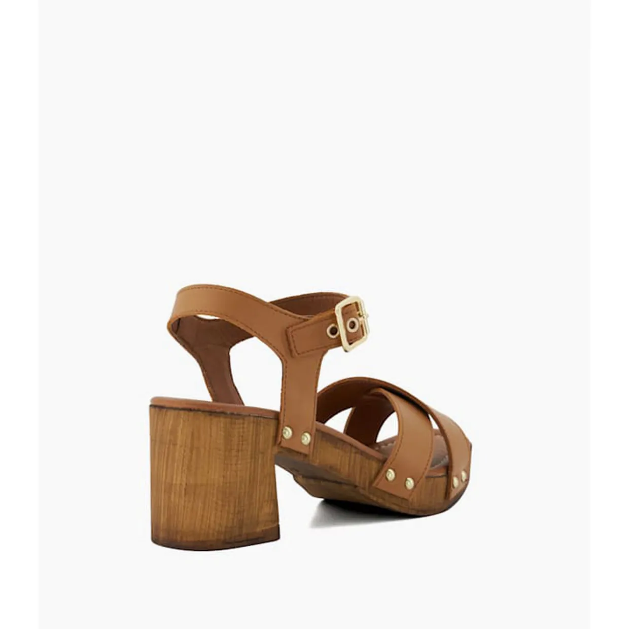 - Block heel, adjustable ankle strap with buckle fastening, crossover toe straps, open toe, gold-tone hardware, stud details