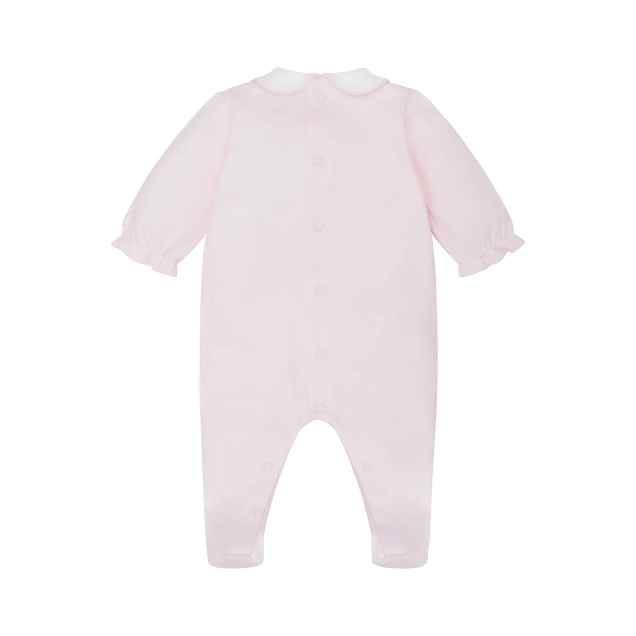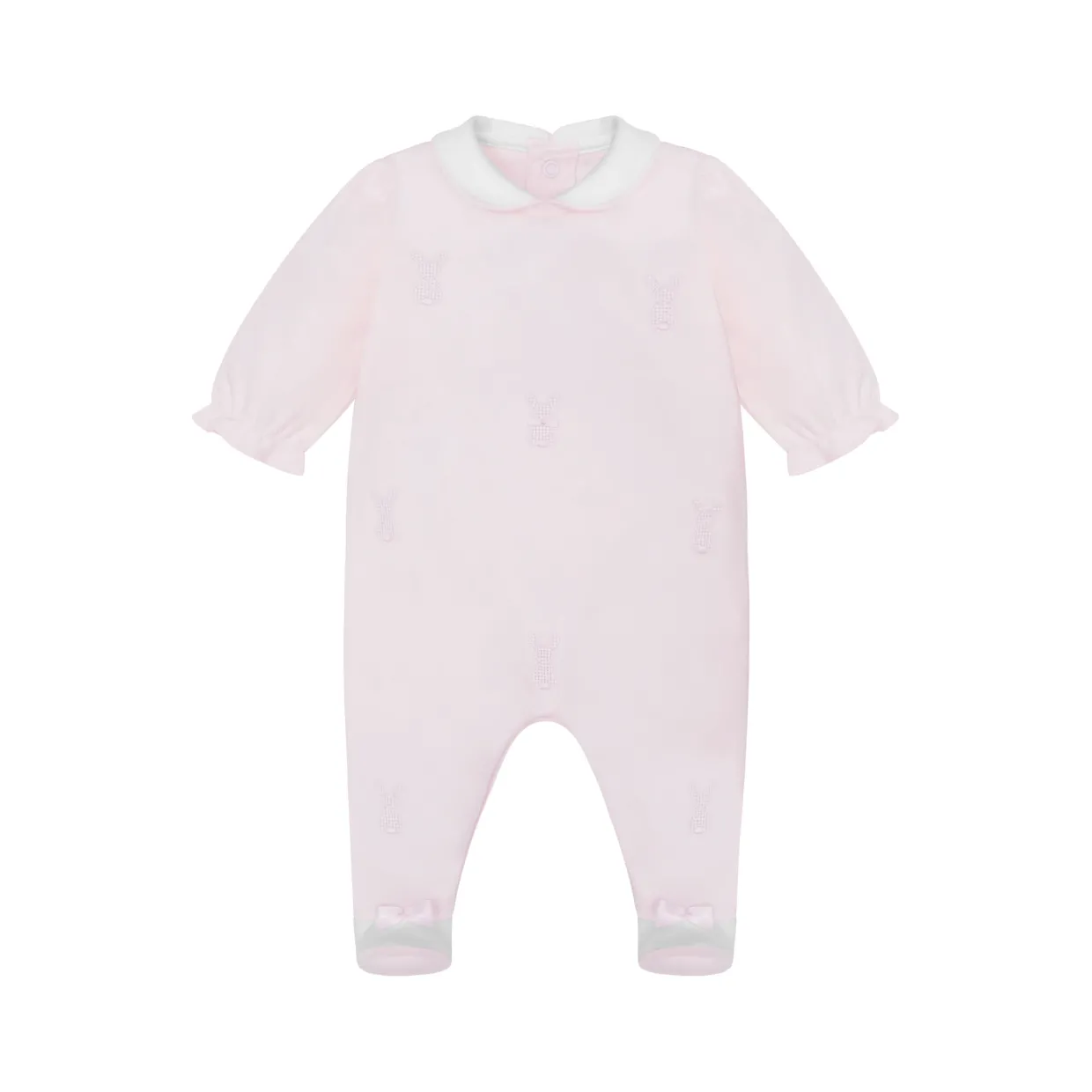 - Babygrow: Embroidered bunny details, rounded contrast collar, piped trim, satin bow detailing, frilled cuffs, snap button fastening. Hat: Embroidered bunny details, pull-on style