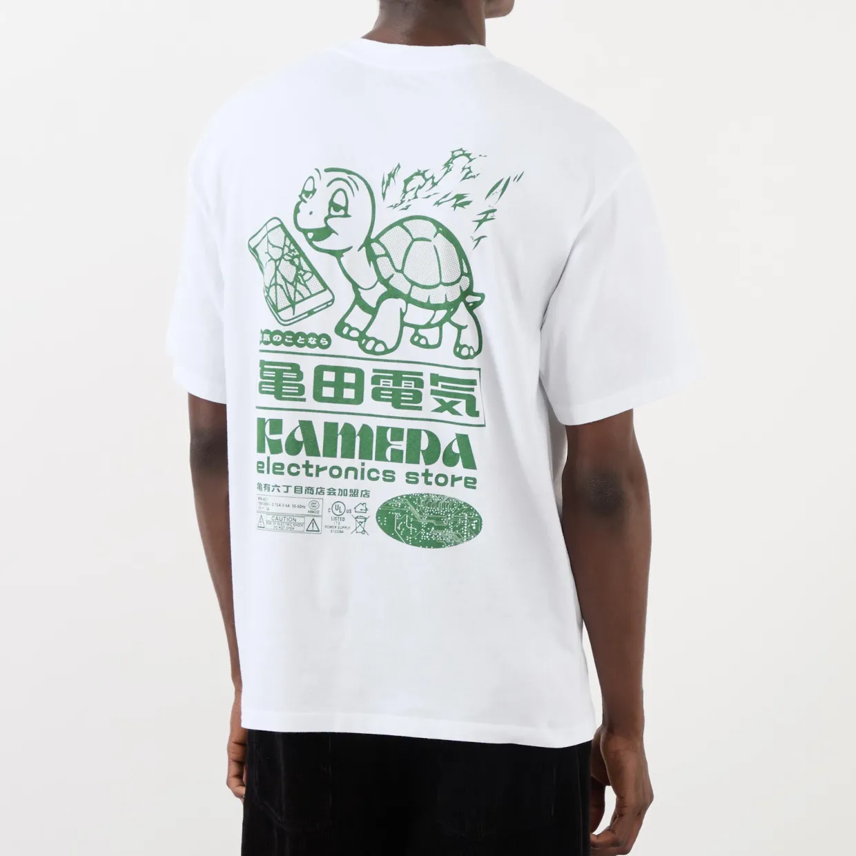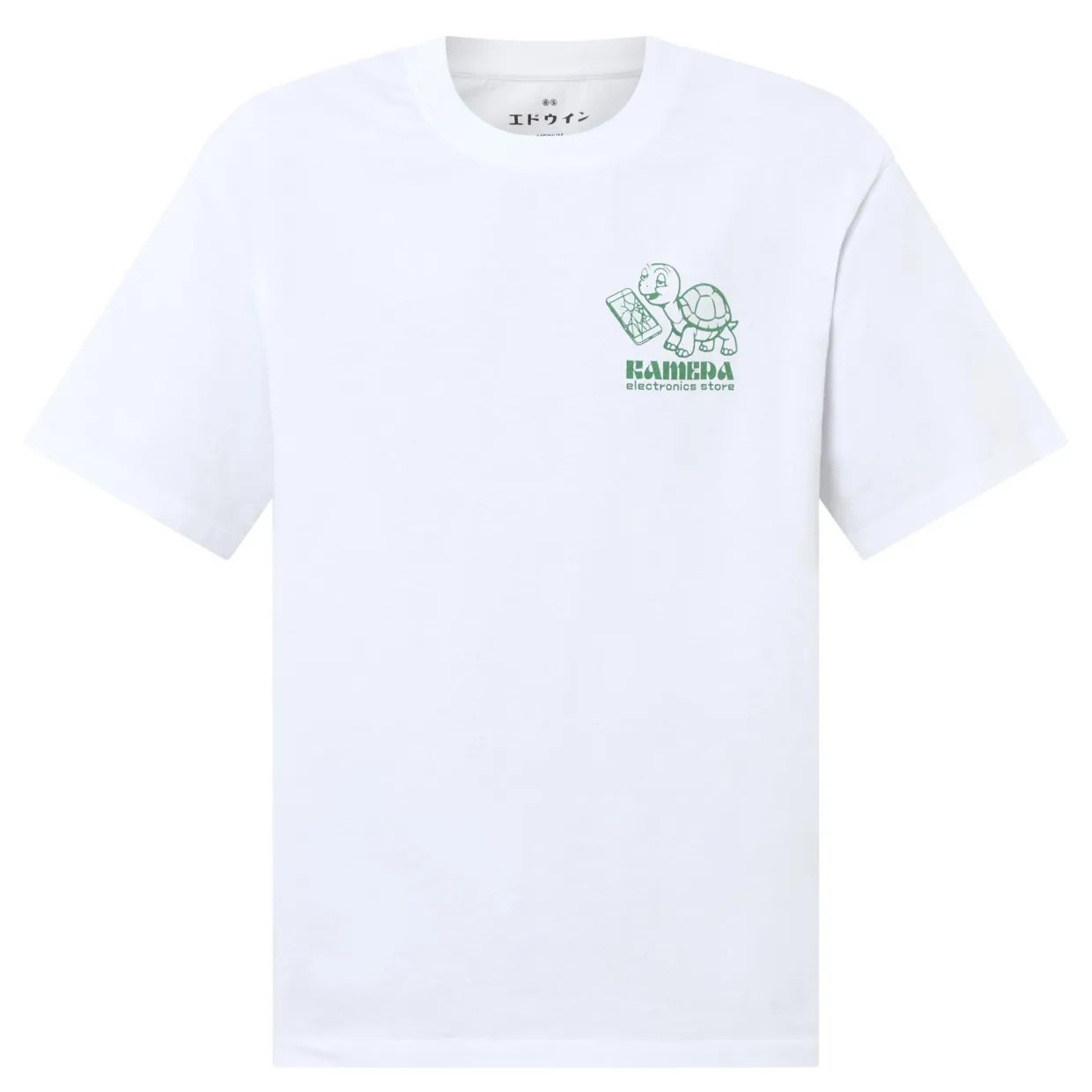 - Turtle print, round neck, short sleeves, straight hemline, logo detail