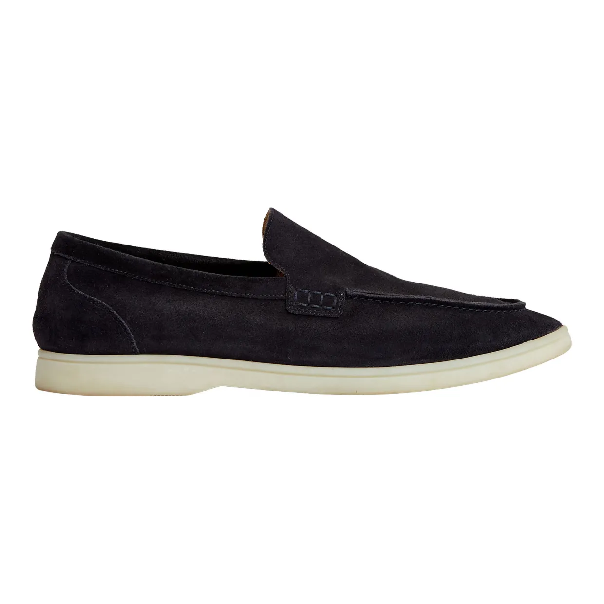 - Suede finish, slip-on design, tonal topstitching, contrast rubber sole
