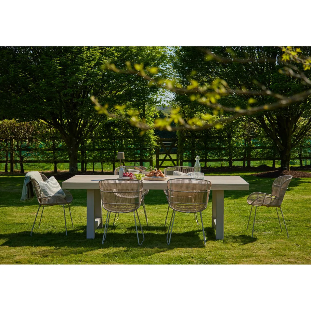 Whether you are hosting a summer barbecue, or enjoying a quiet al fresco lunch, the sophisticated Kingsville Garden Dining Set is sure to help create unforgettable outdoor experiences. The sturdy table is carefully processed to achieve a distinctive timeworn look that invites character and structure to your garden. The six chairs compliment the table perfectly and add both comfort and visual appeal.