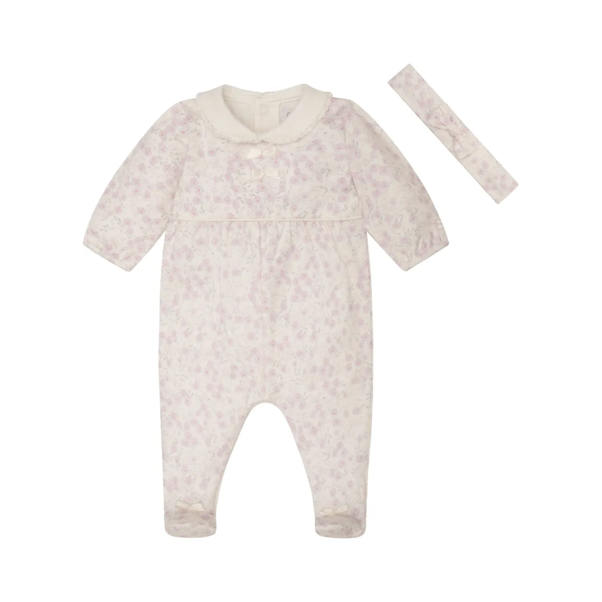 - Babygrow: All-over floral print, lace edge collar, bow detailing, snap button fastenings. Hairband: Floral print, central bow detail, slip-on style