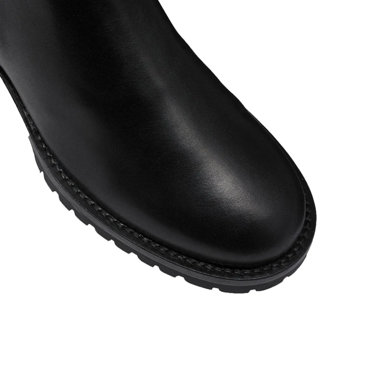 - Side-zip detail, faux-fur lining, leather finish, round-toe silhouette, texturized welt around the sole, stitch detailing, metallic ring-pull tab, durable stacked heel, traction sole, heel branding detail