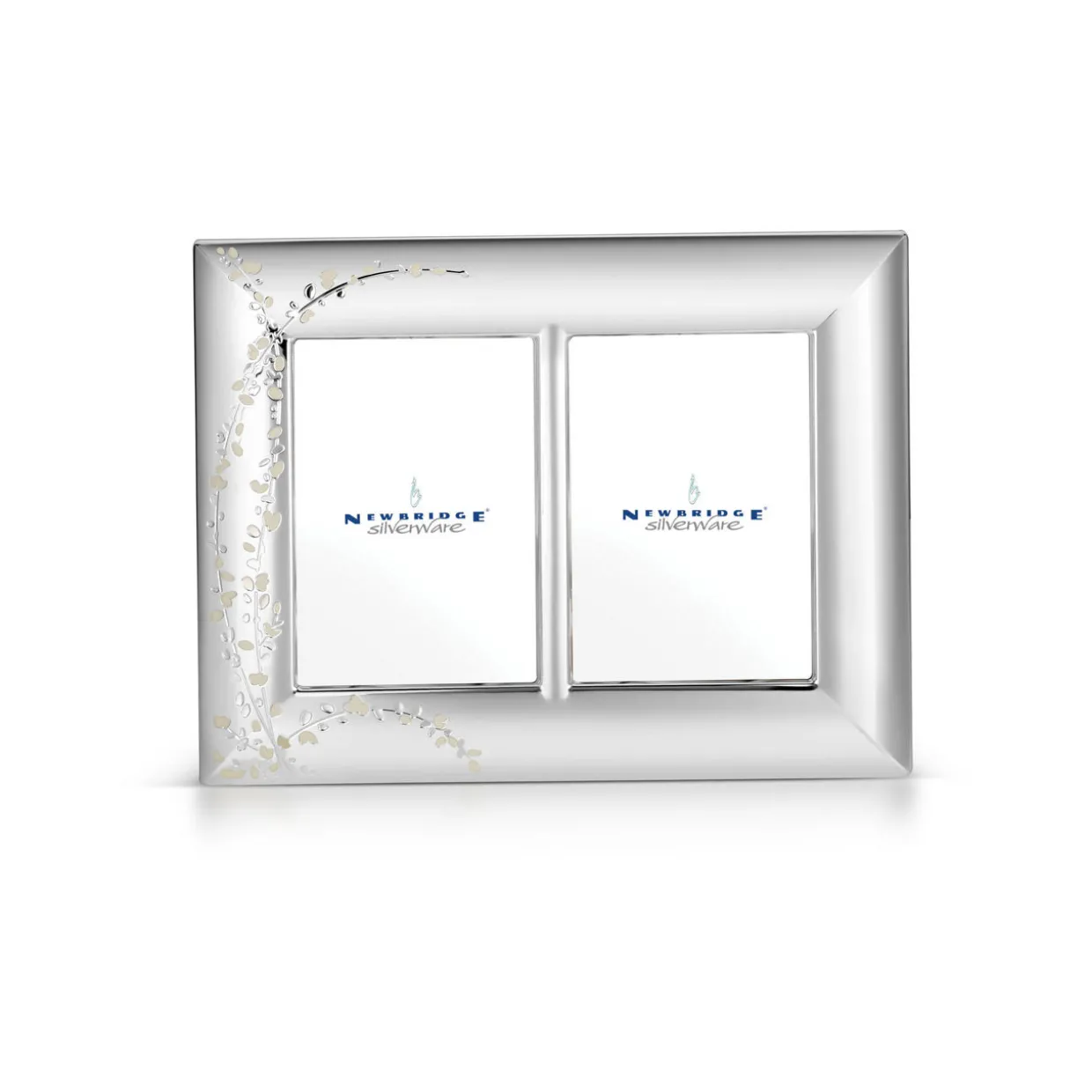 - Silver-plated, protective anti-tarnish layer, double frame design, floral motif detail, fits two 5 x 7 photos, gift box packaging