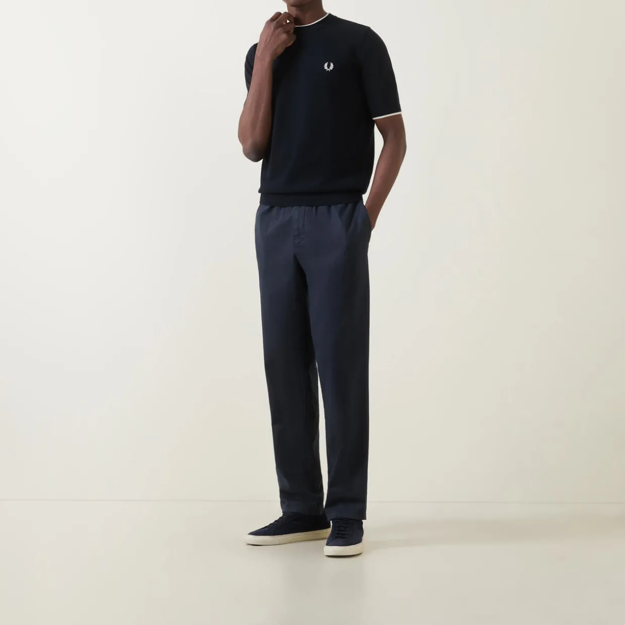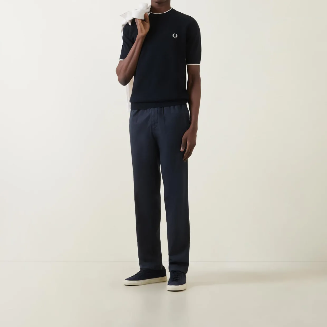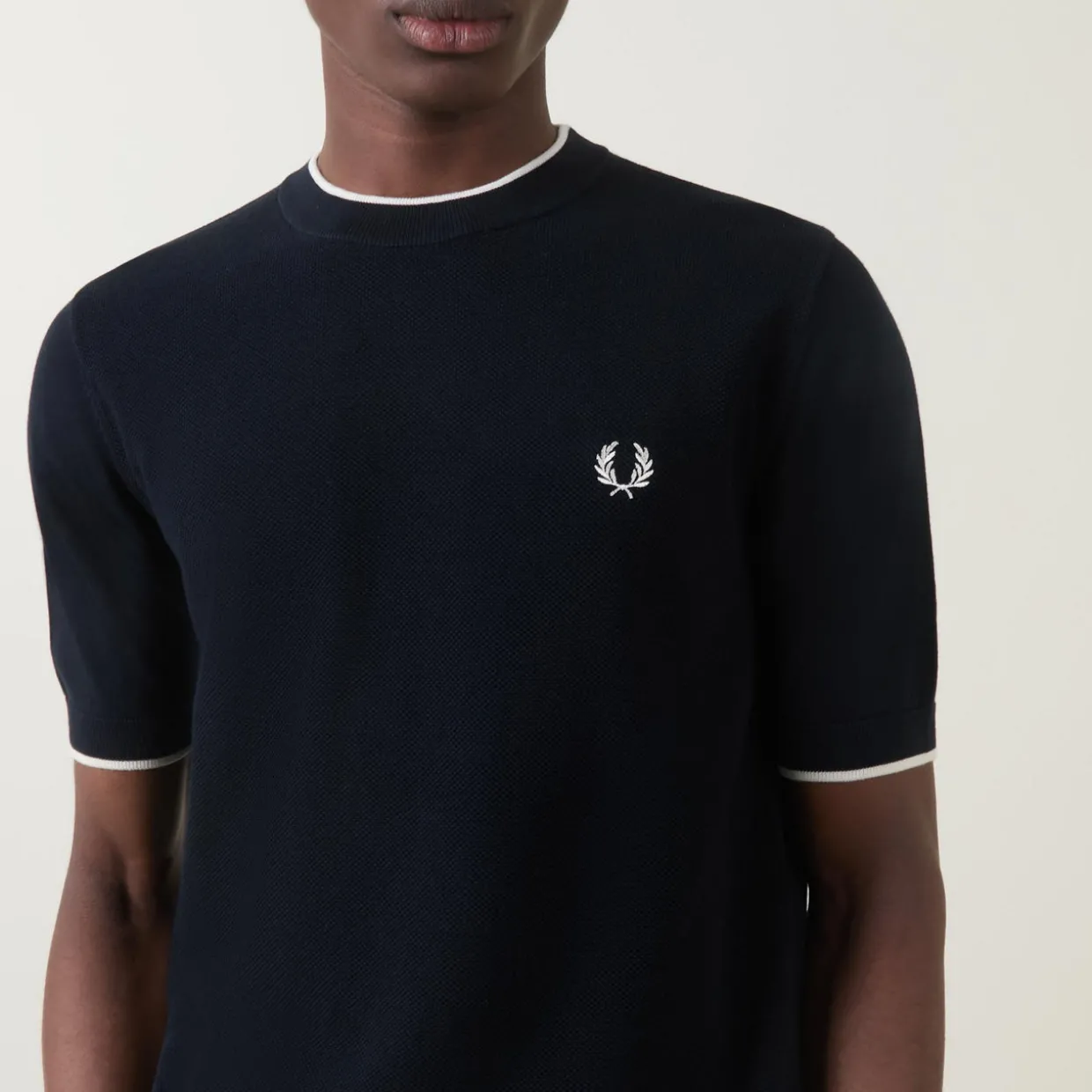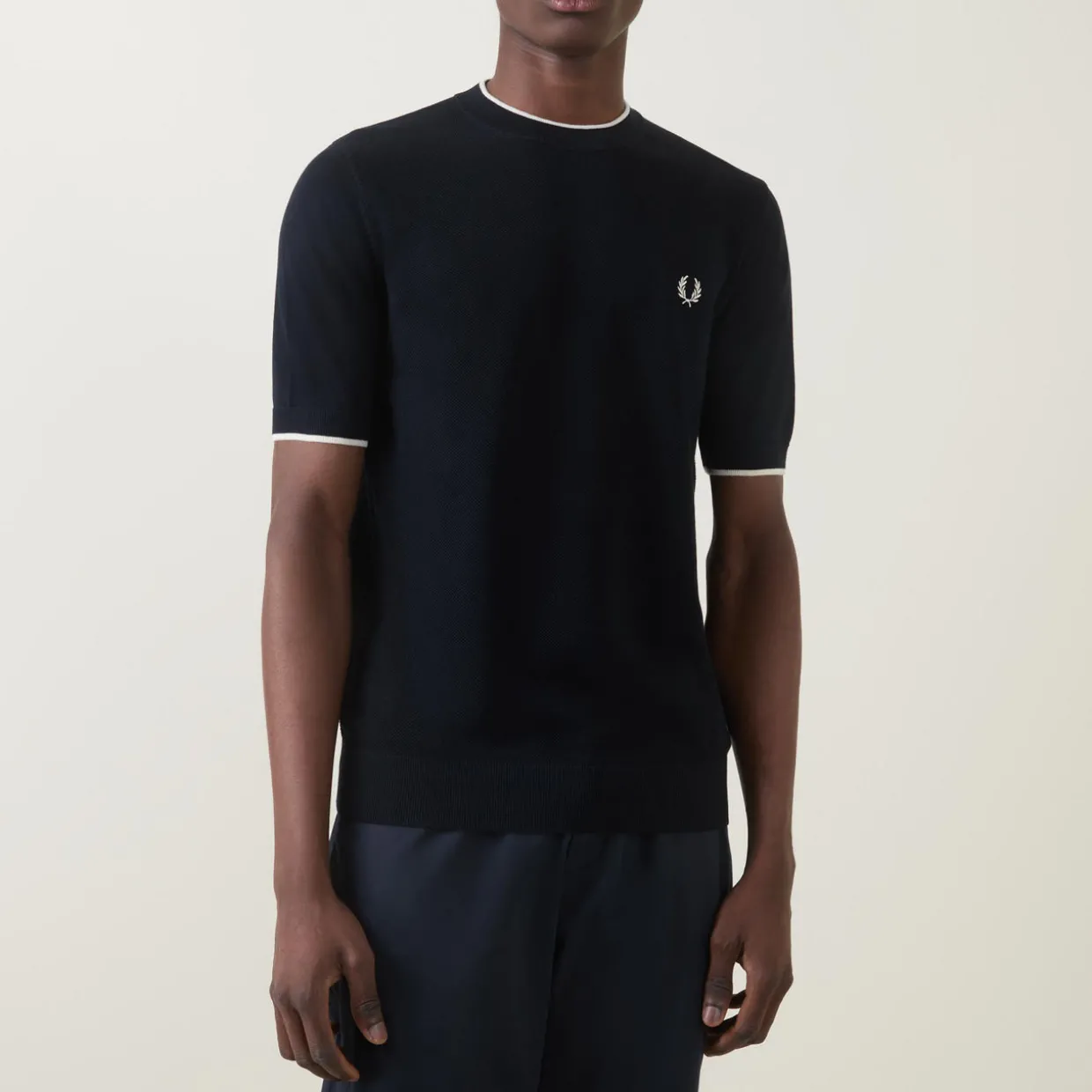 - Crew neck, short sleeves, straight hem, contrast-trim detailing, contrasting embroidered Laurel Wreath logo on the chest, knit construction, solid finish