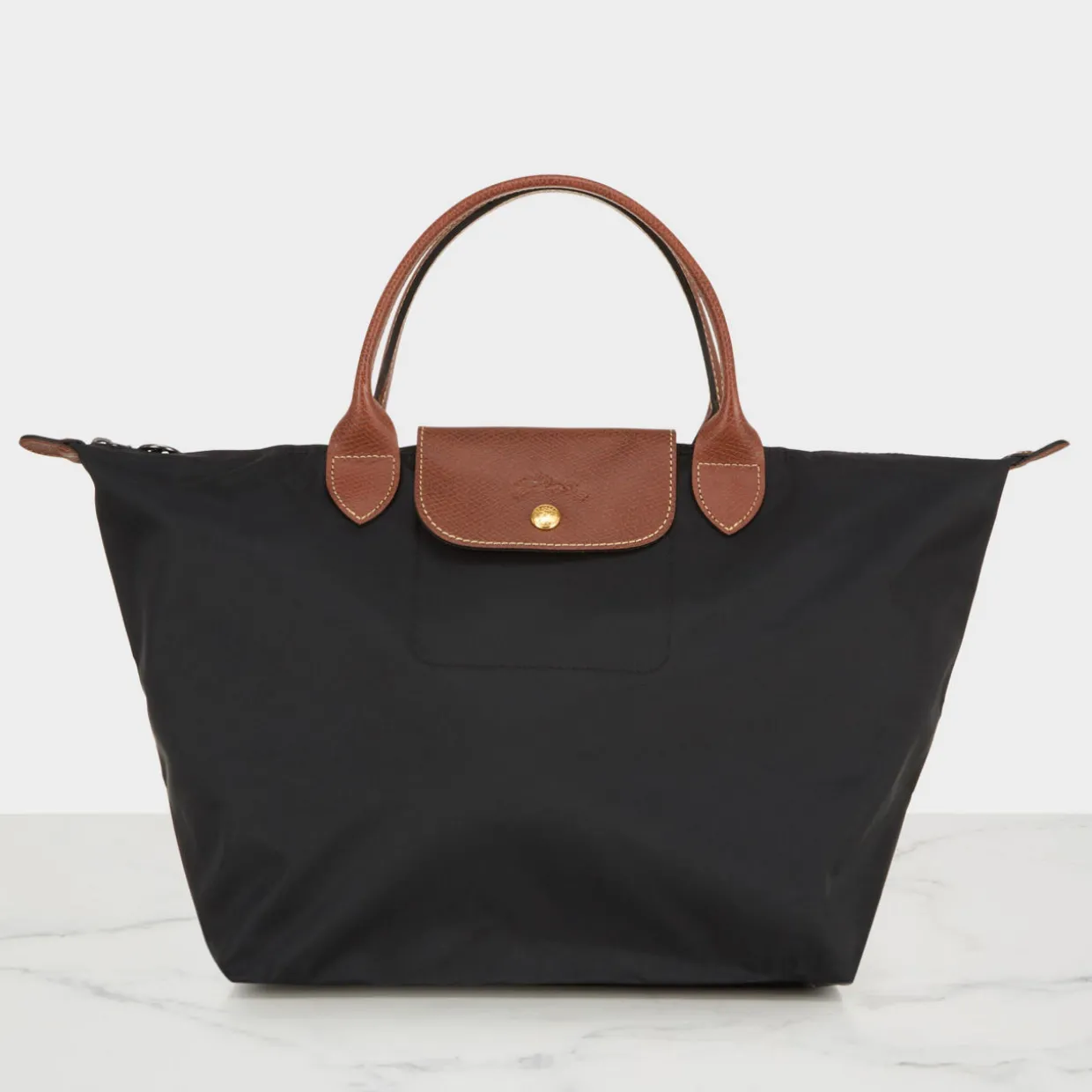 - Top handles, metal hardware, flap button with top-zip fastening, embossed logo