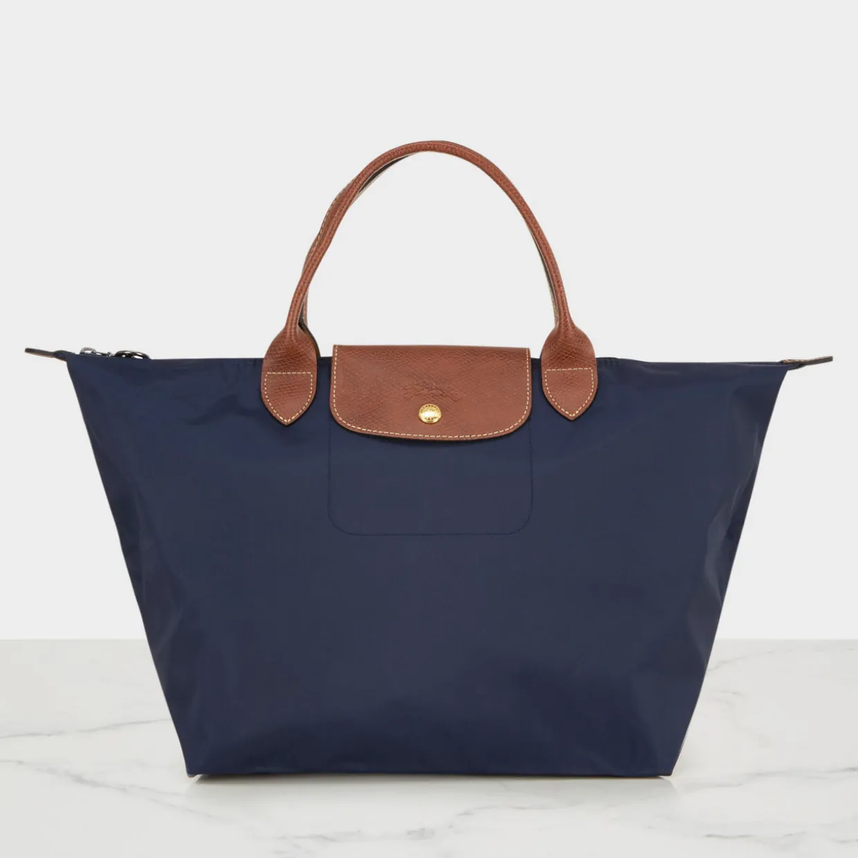 - Top handles, metal hardware, flap button with top-zip fastening, embossed logo
