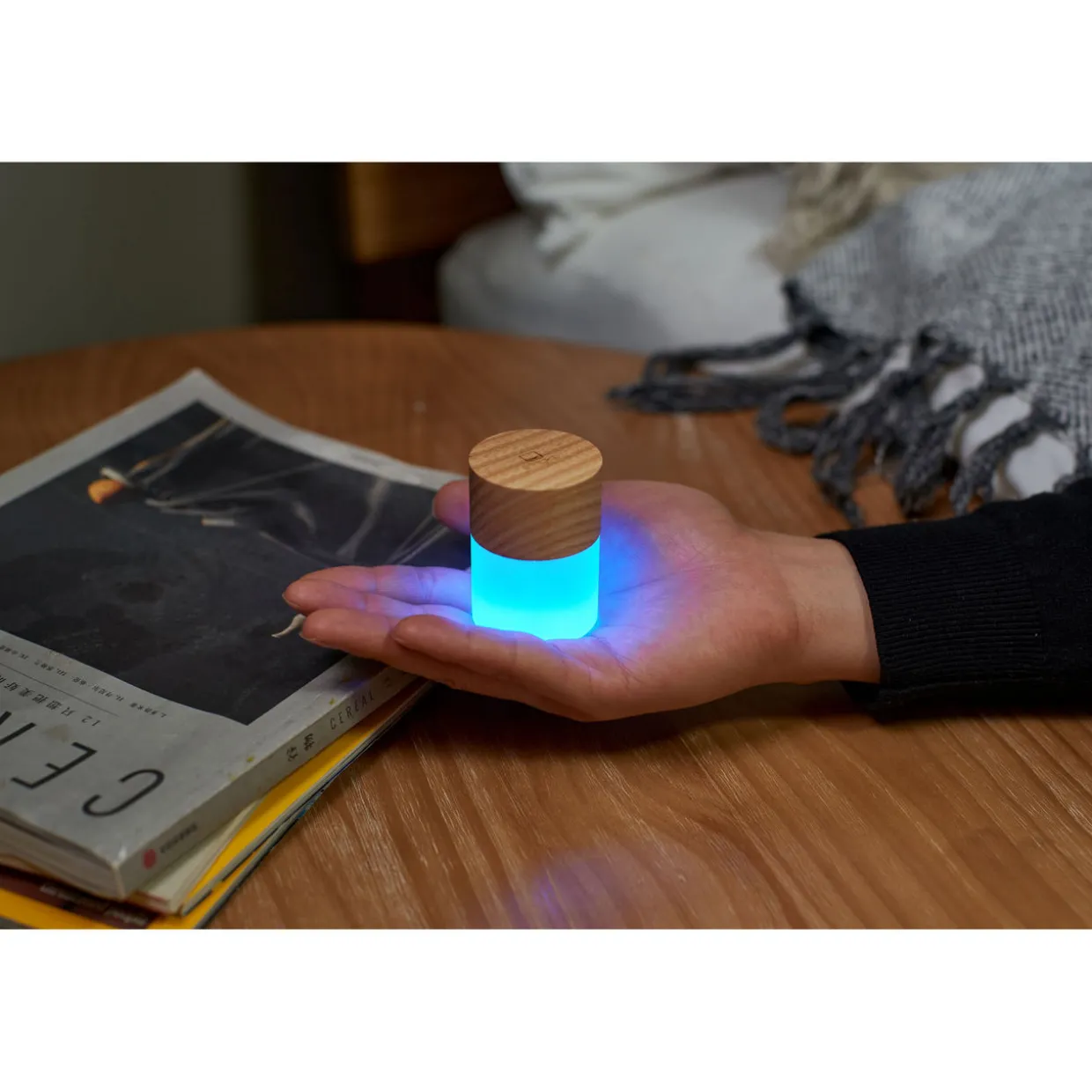 - Cylindrical design, frosted glass, sustainable wooden detailing, seven vibrant alternating colours
