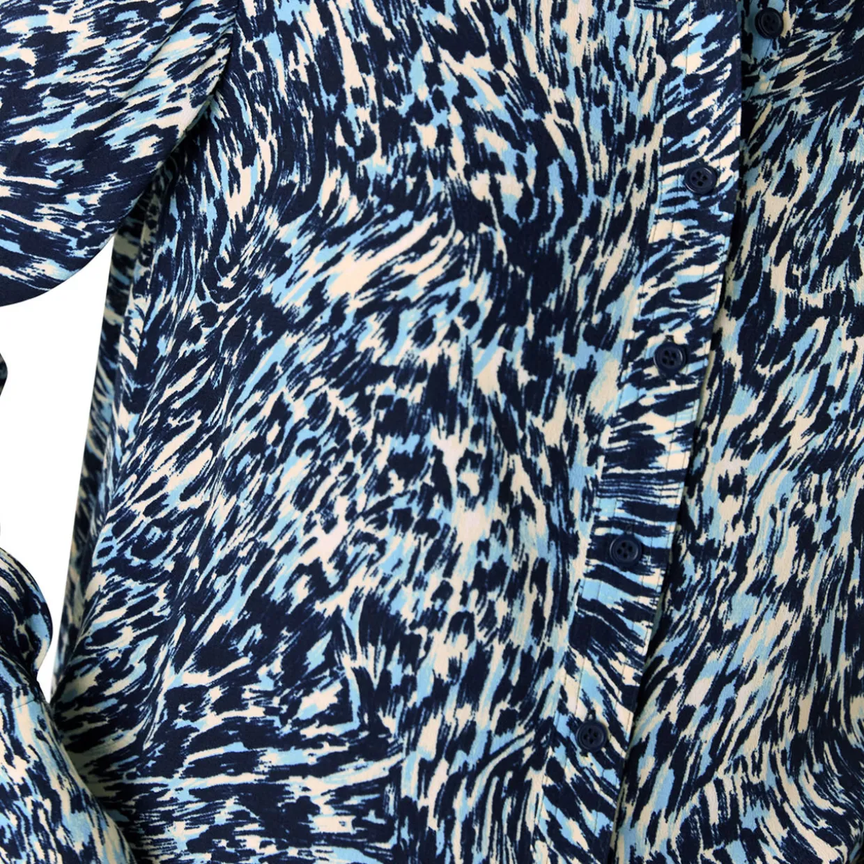 - Point collar, leopard swirl print, button fastenings, curved hem to back