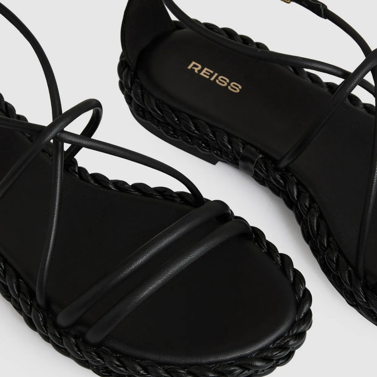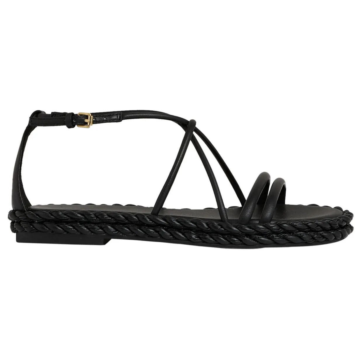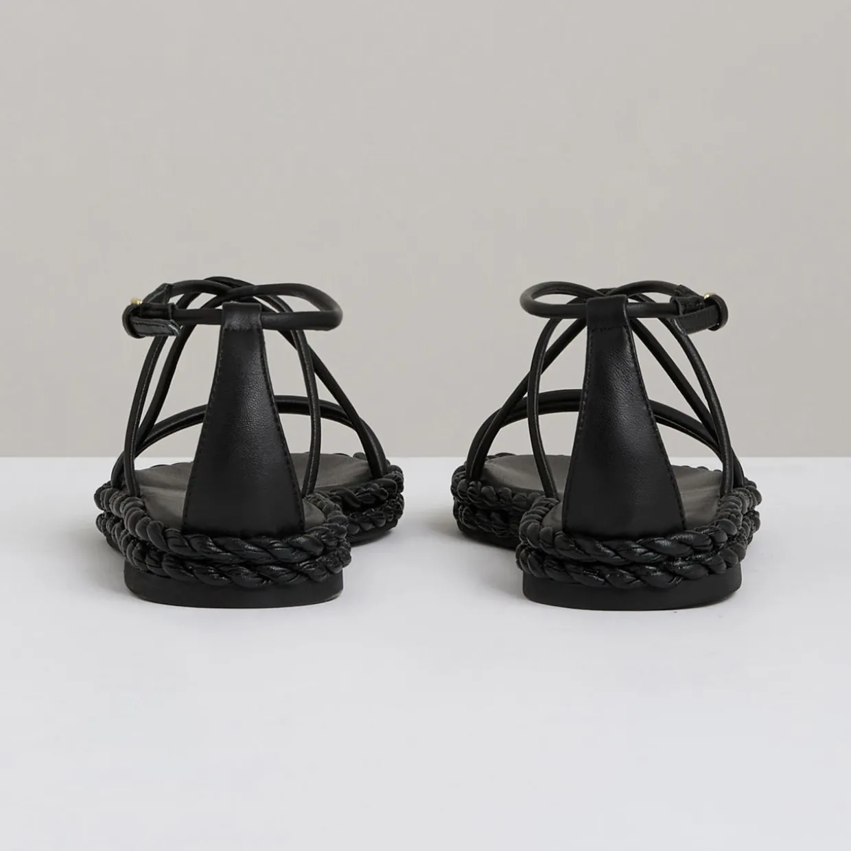 - Double-braided edge, smooth leather design, rolled straps, side buckle fastening, rubber sole, round open toe