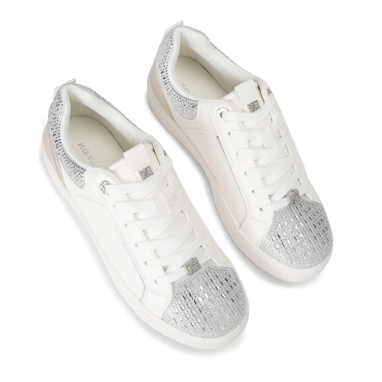 - Grained faux-leather, crystal embellishment, lace-up front, branding details