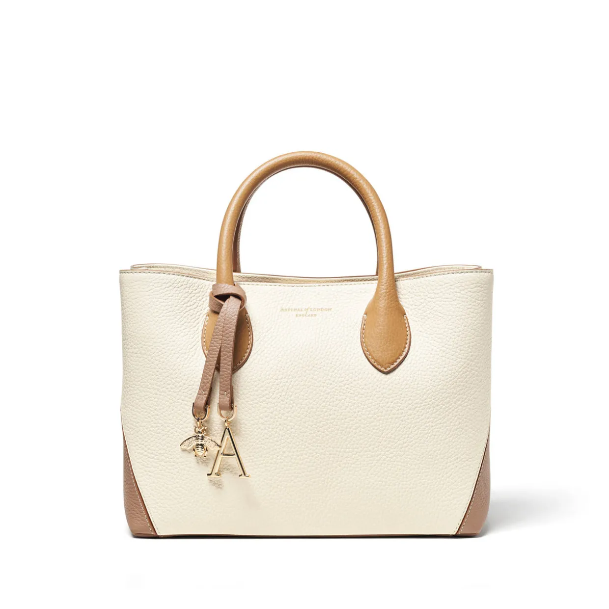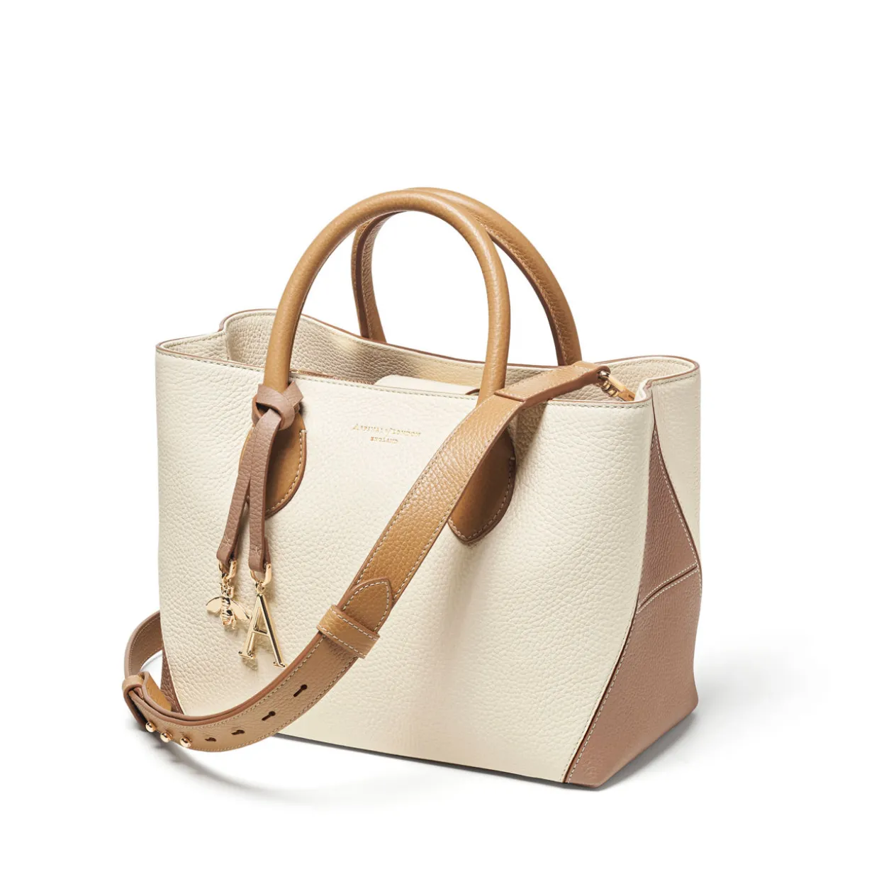 - Full-grain leather, stitched ‘A’ panels, gold-tone bee charm, gold-tone ‘A’ charm, top handles, detachable crossbody strap, snap fastening, brand logo details, purse feet