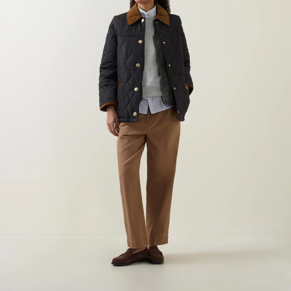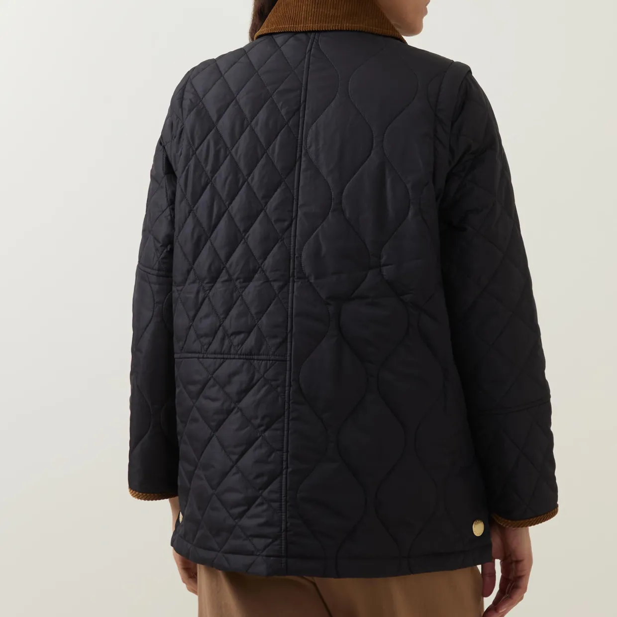 - Corduroy collar, long sleeves, front snap button placket, two front slip pockets, straight hem, diamond and onion-quilted design, embroidered logo detail, corduroy finishes