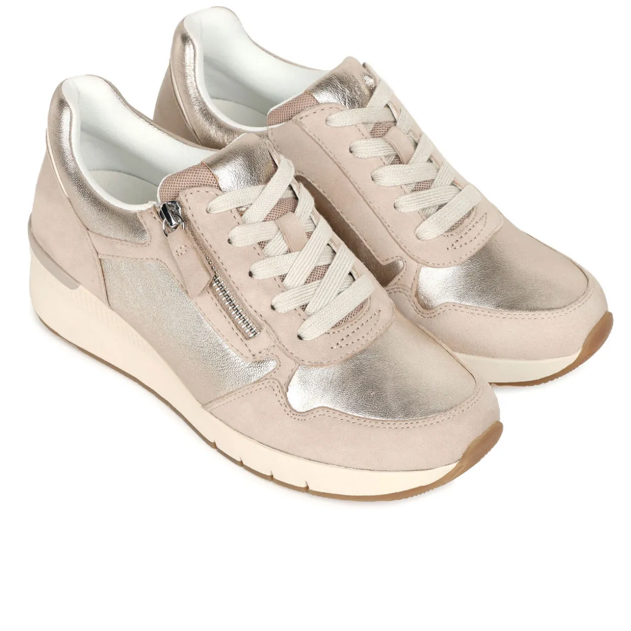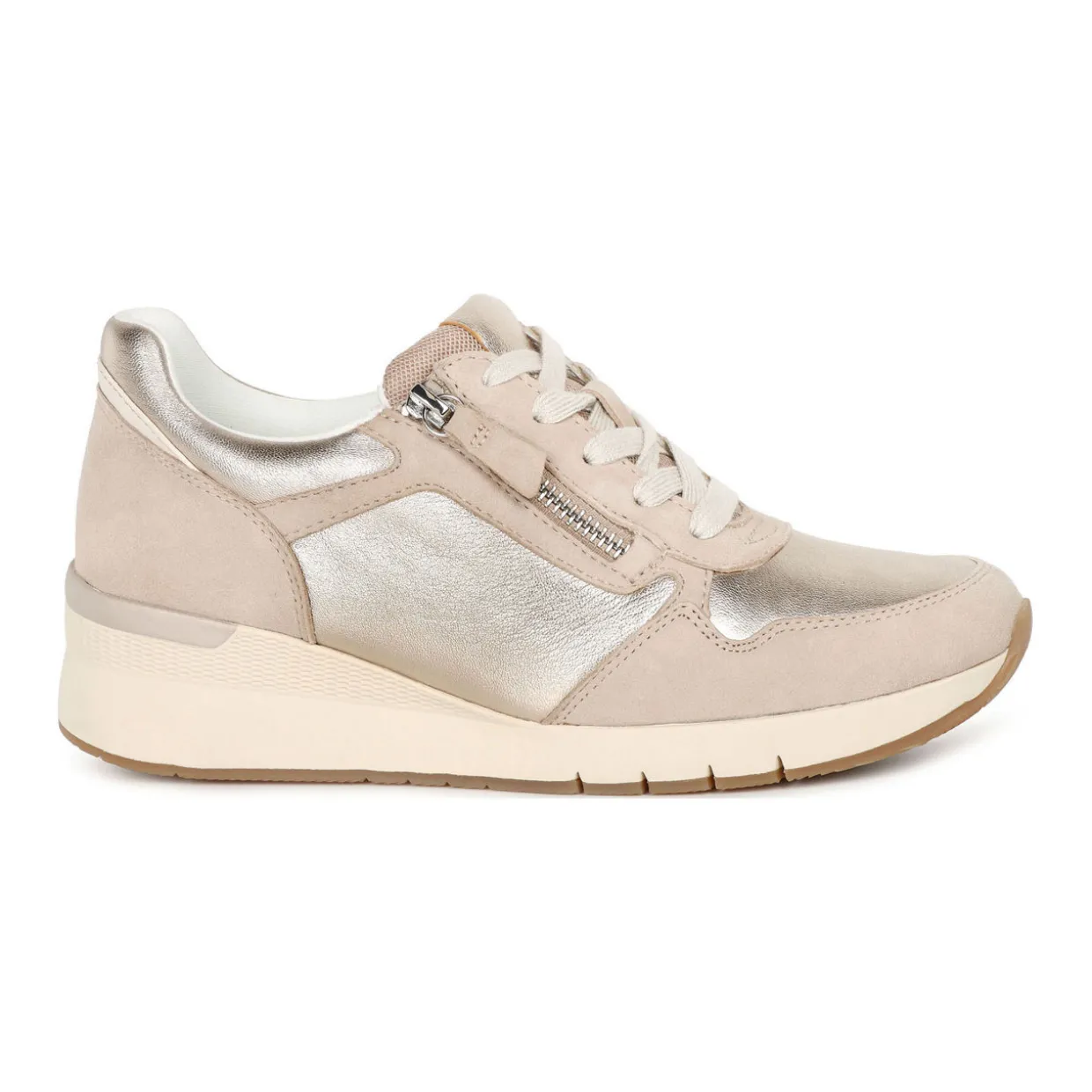 - Soft upper, dual fastenings, lace-up and zip closure, panelled design, contrast accents, silver-tone finishes, wedge heel soles, underfoot support