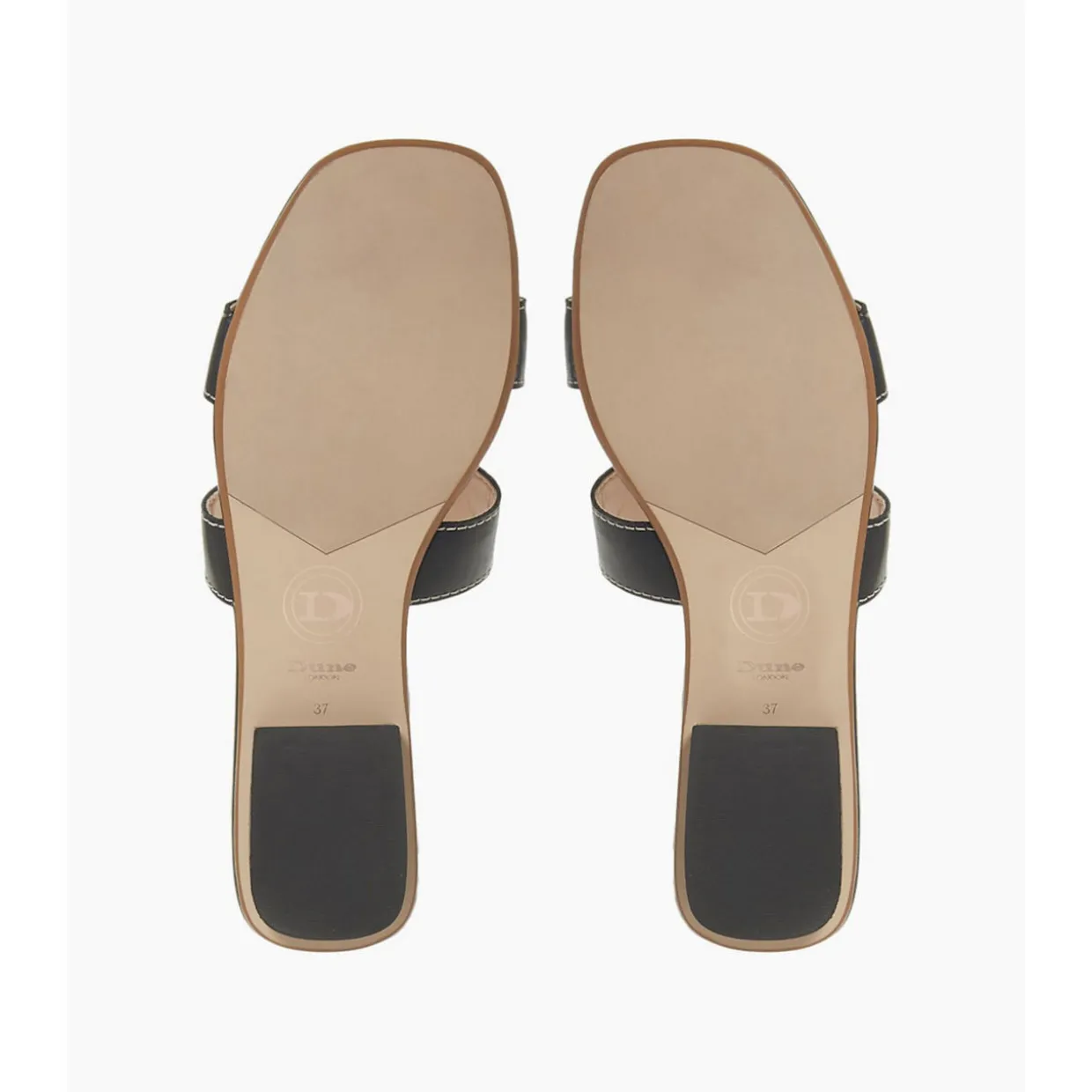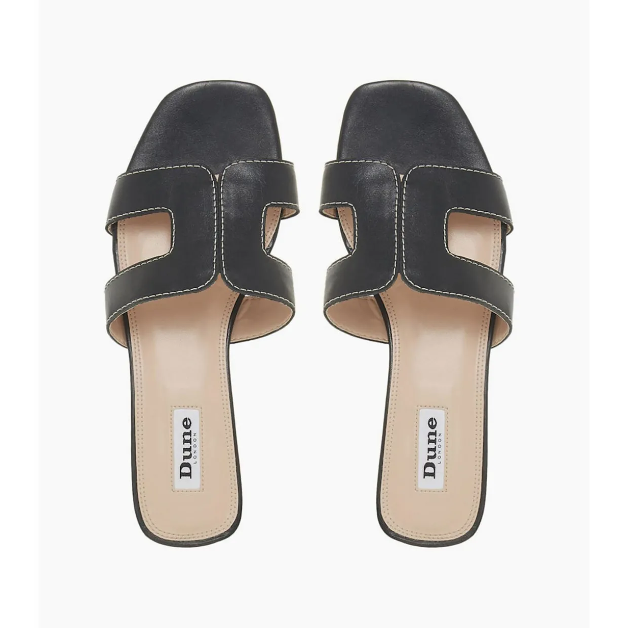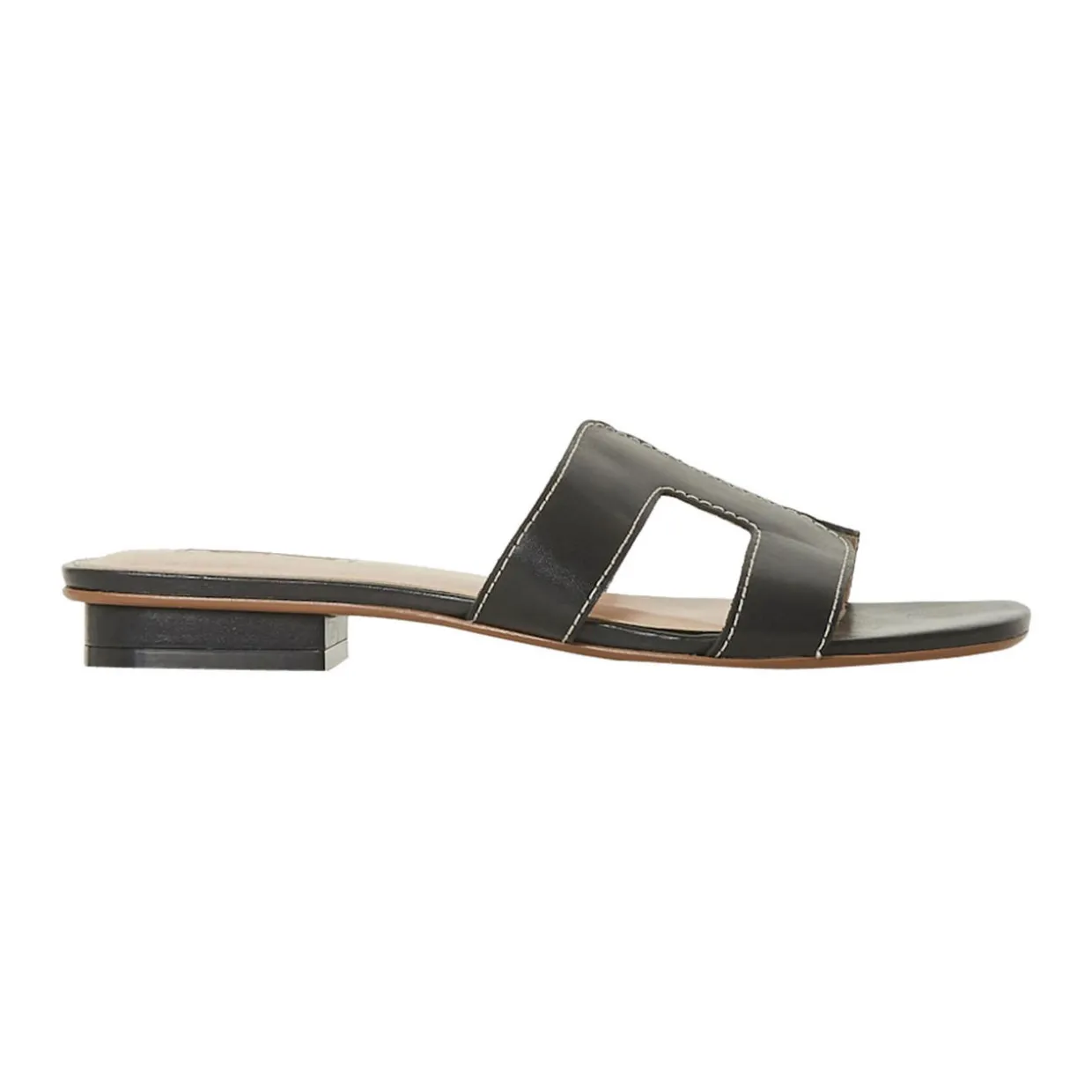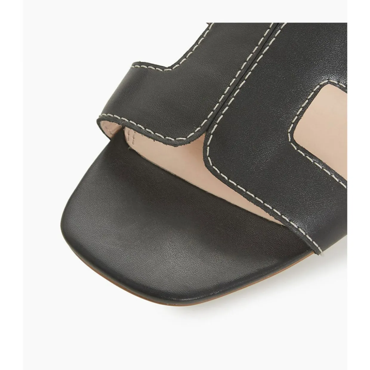 - Slip on style, open toe, cut-out straps, stacked heel.