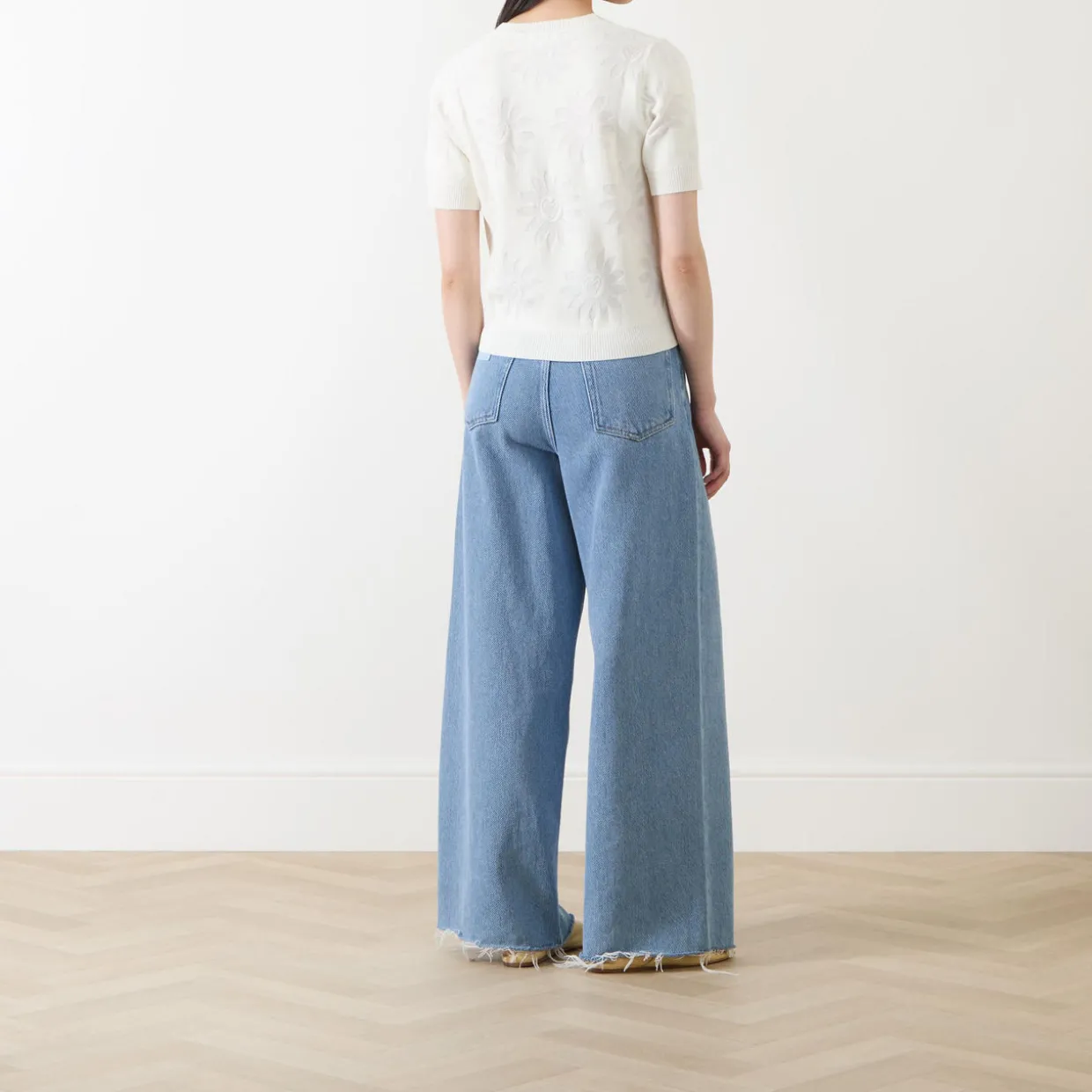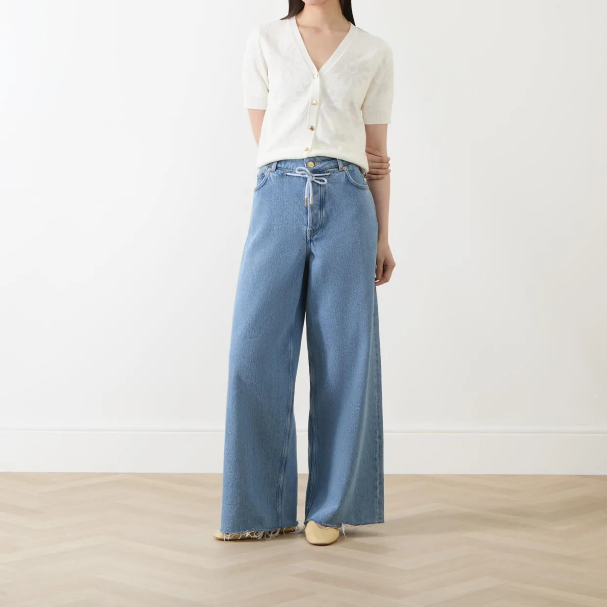 - V-neckline, short sleeves, front button fastening, straight hem, ribbed trims, floral jacquard design, knit construction, gold-tone hardware