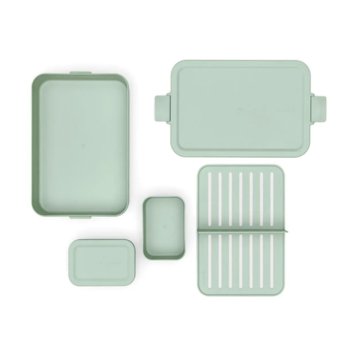 - Bring your own – on-the-go lunch box.Flexible – L volume for 8 sandwiches or 4 sandwiches and 2 containers (2L).Separated storage – bento design with divider and/or 2 containers.Locked tight – lid with clips.No spills – secure click closing.Handy – divider doubles as lifting tray.