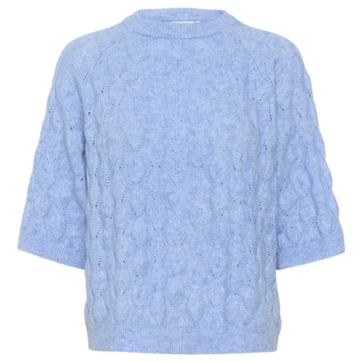 - Round neckline, diamond stitch knit, raglan three-quarter length sleeves
