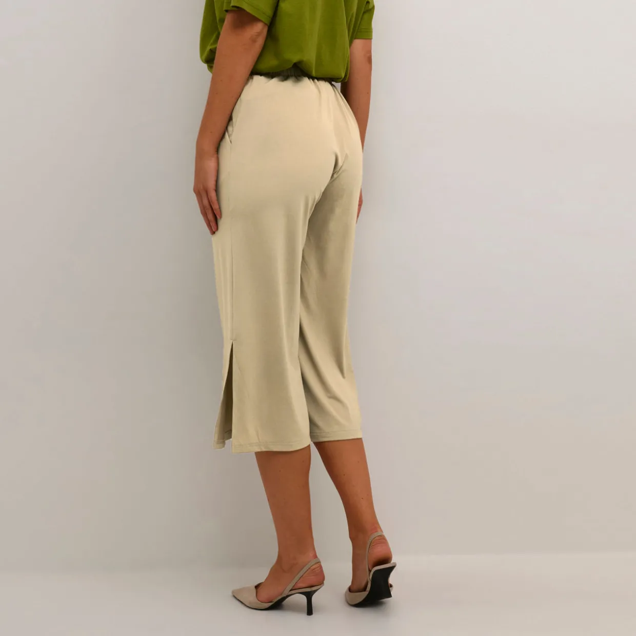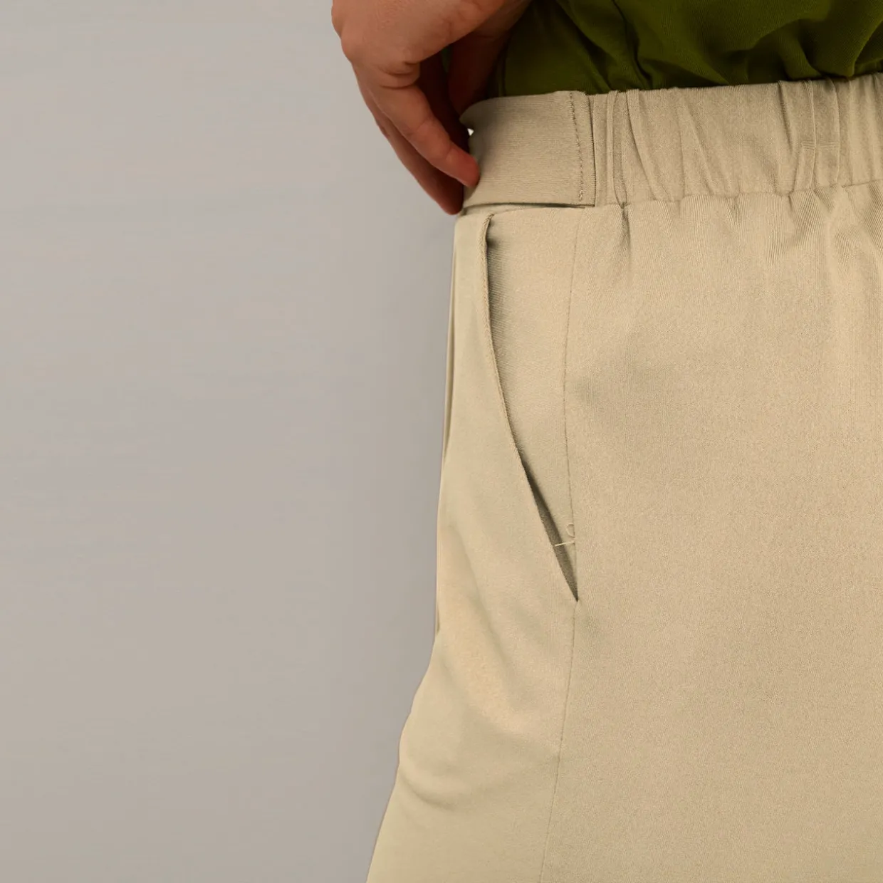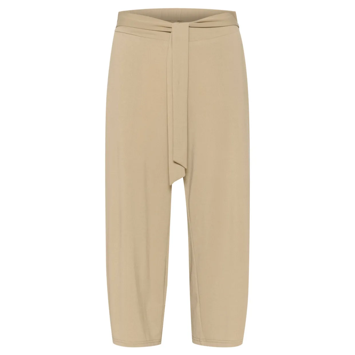 - Elasticated waistband with self-tie belt, side entry pockets, split side seams