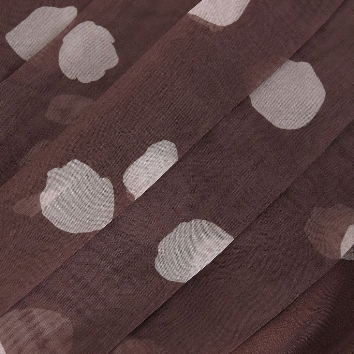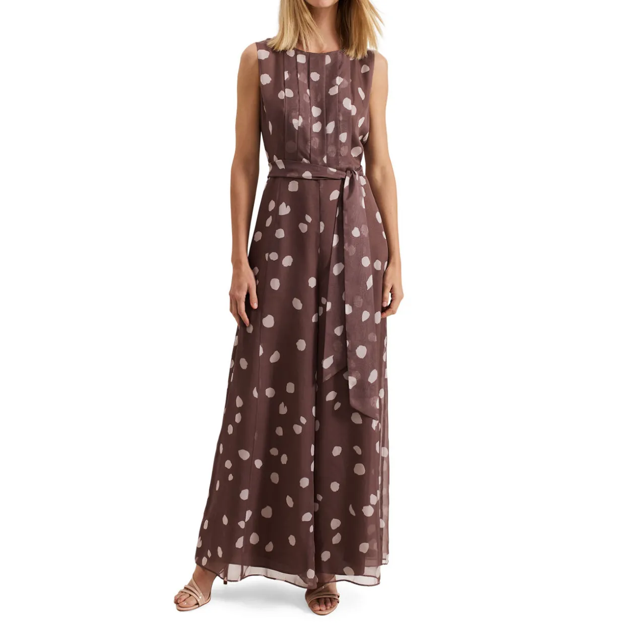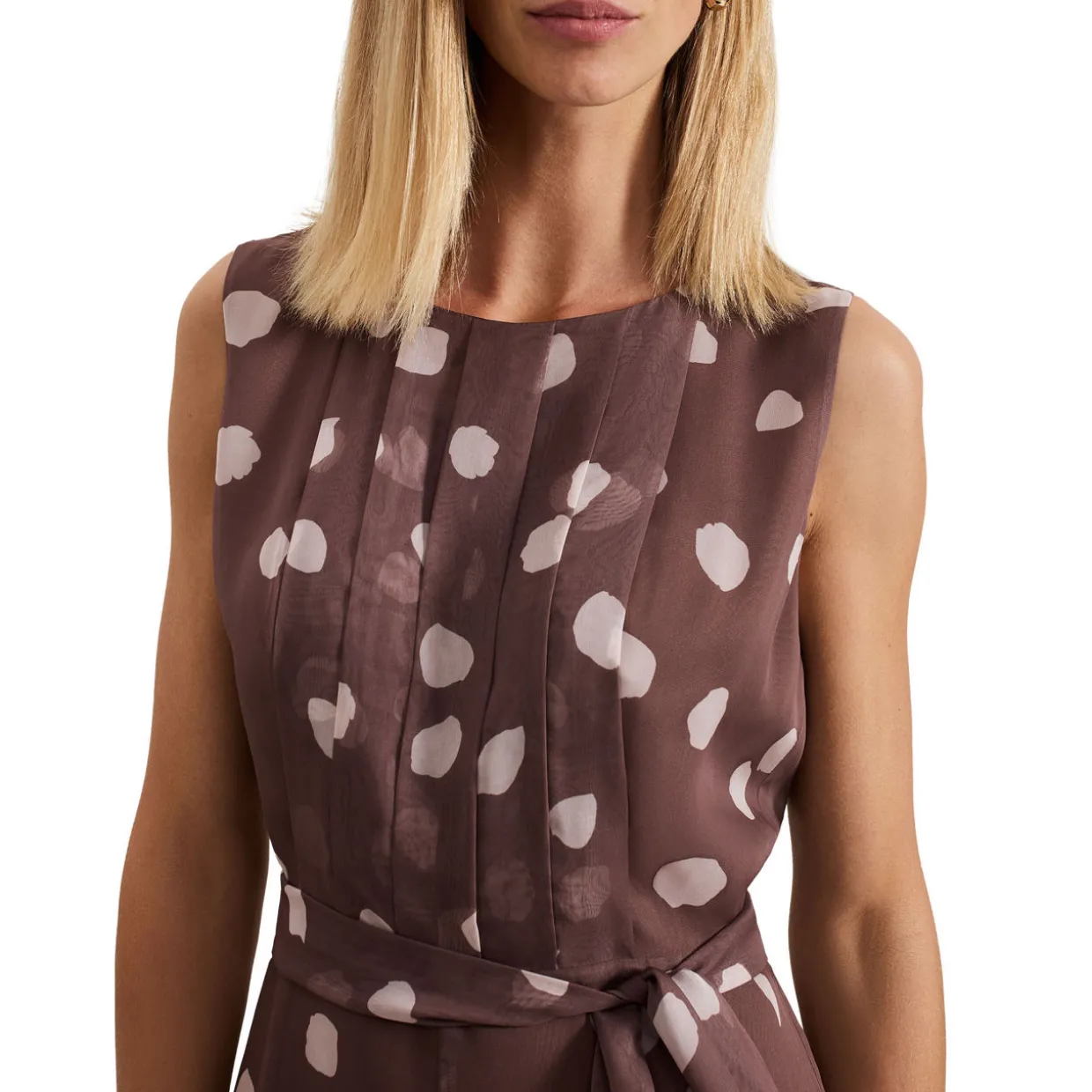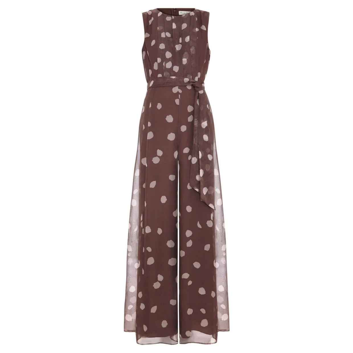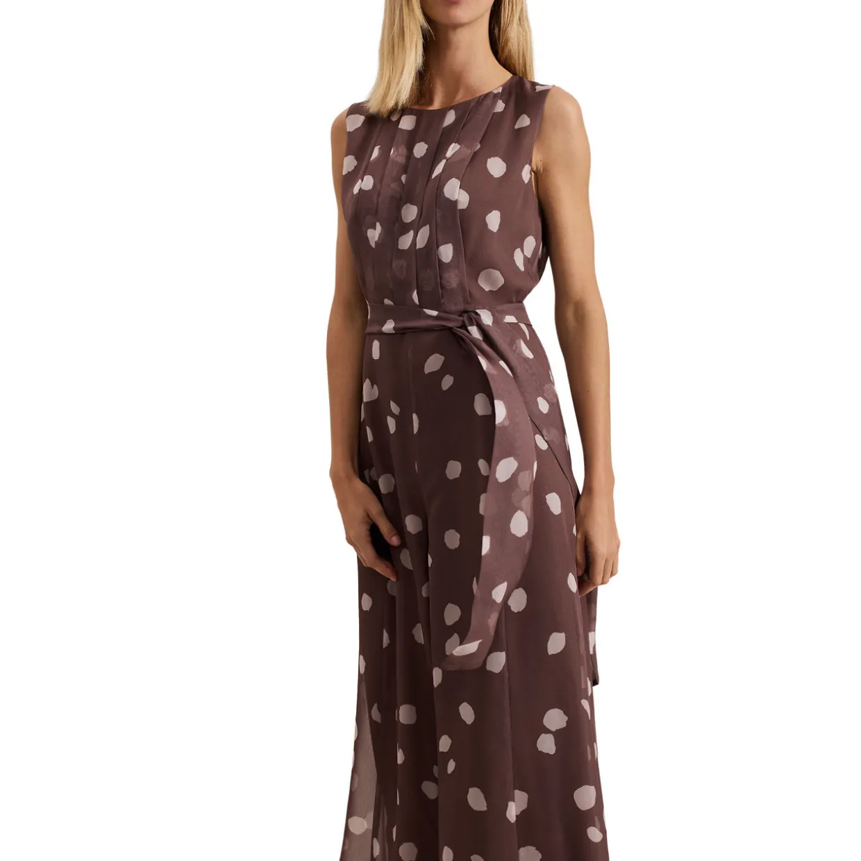 - Chiffon fabric, polka-dot print, subtle pleating on the bodice, sleeveless design, self-tie belt, wide leg silhouette, concealed zip fastening, round neckline