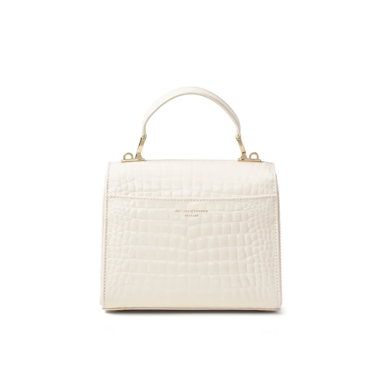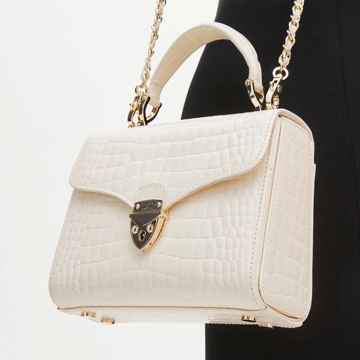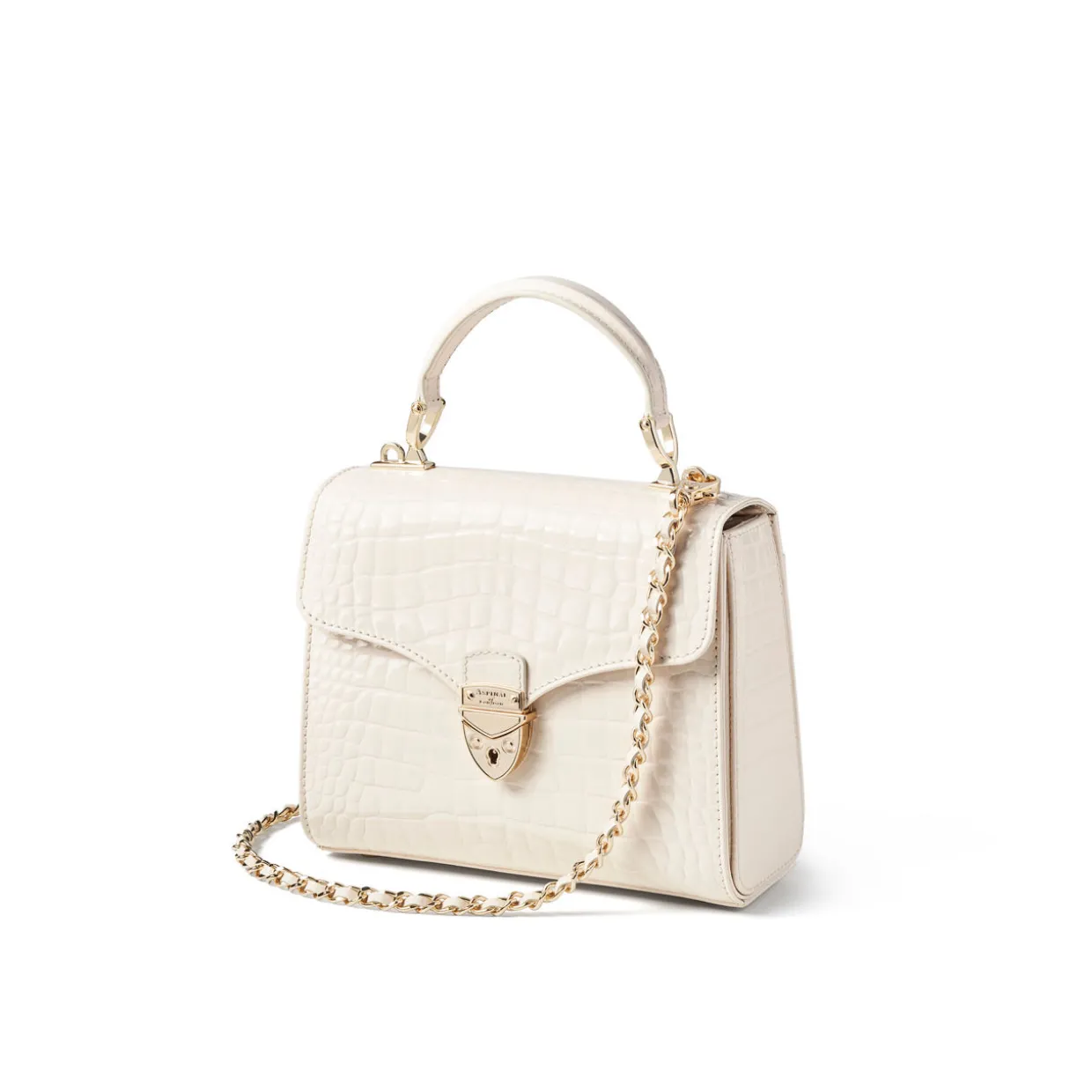 - Top handle, flap closure with signature shield lock fastening, detachable chain-plaited strap, one exterior slip pocket with magnetic fastening, gold-tone hardware, logo lettering, lined, croc-embossed patent finish
