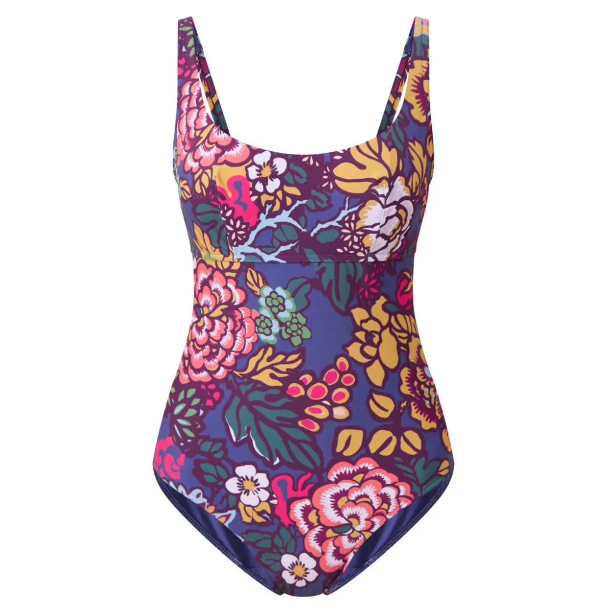 - Straight scoop neckline, adjustable straps, inner structure with under wiring, hollow back, moderate coverage, bloom print
