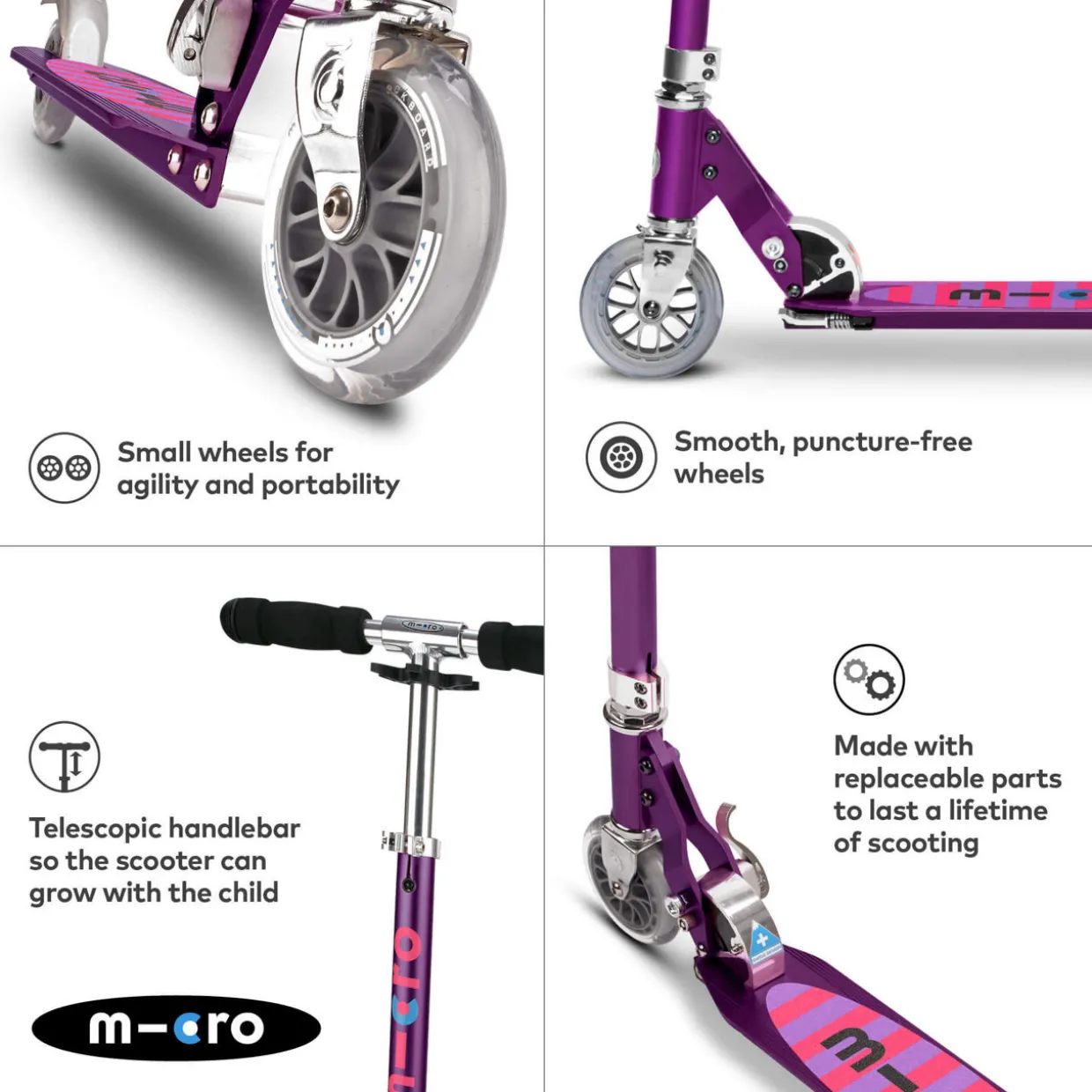 - Soft grip handlebars, adjustable, folds flat, two wheels, kickstand, stripe details, rear brake