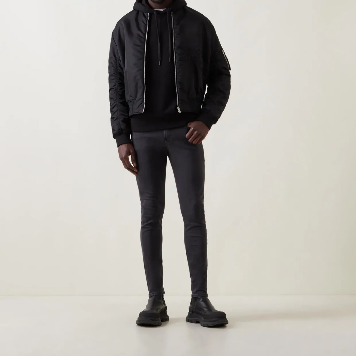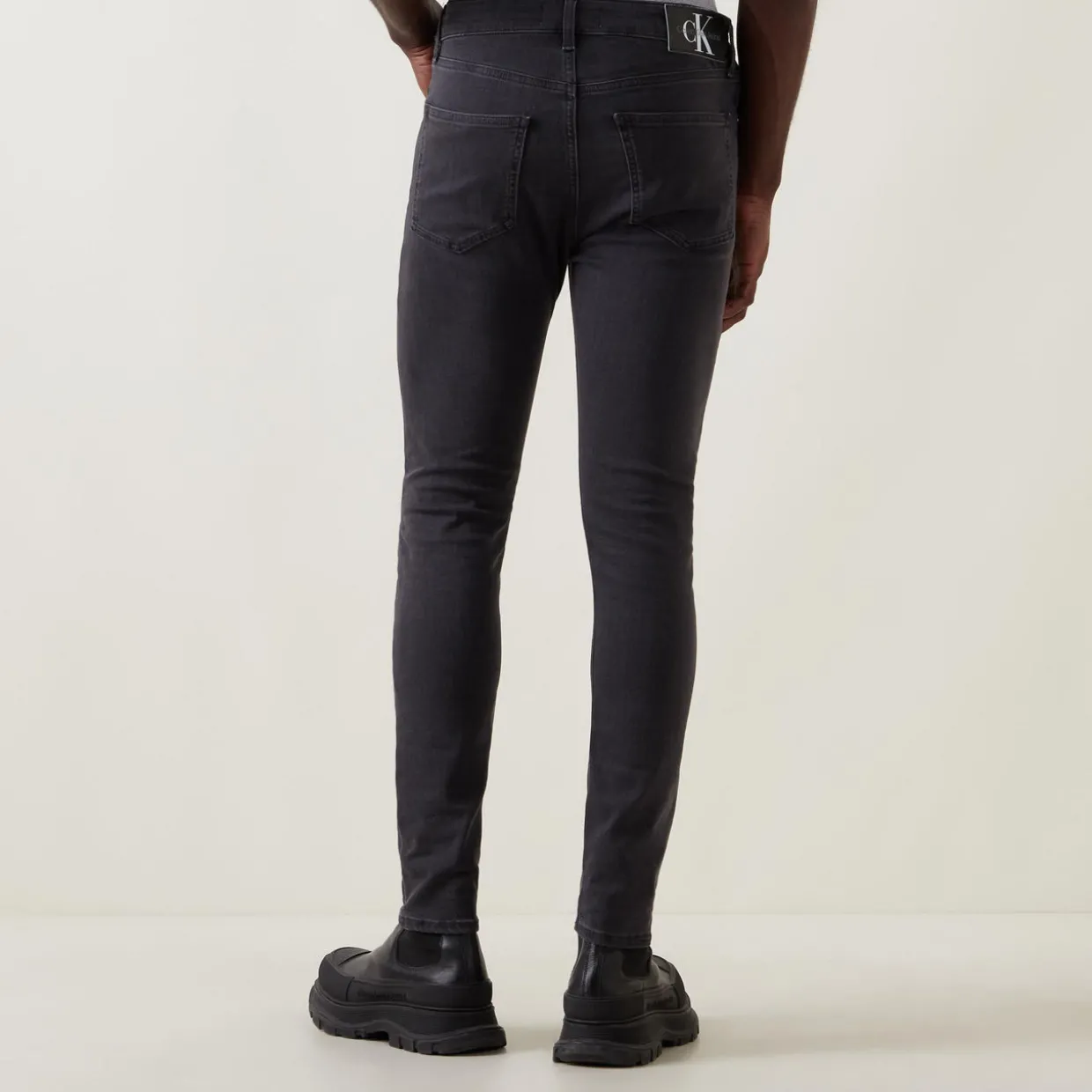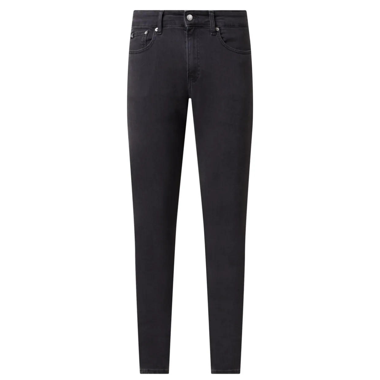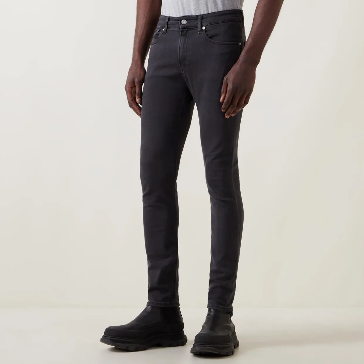 - Mid rise, skinny leg, belt loops, five pockets, logo patch