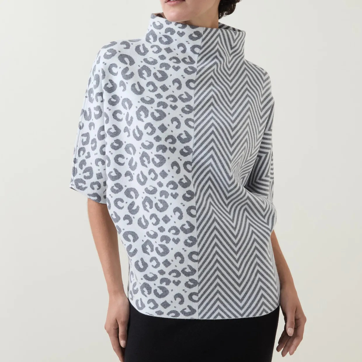- Funnel neck, half-length sleeves, curved hem, multi print pattern
