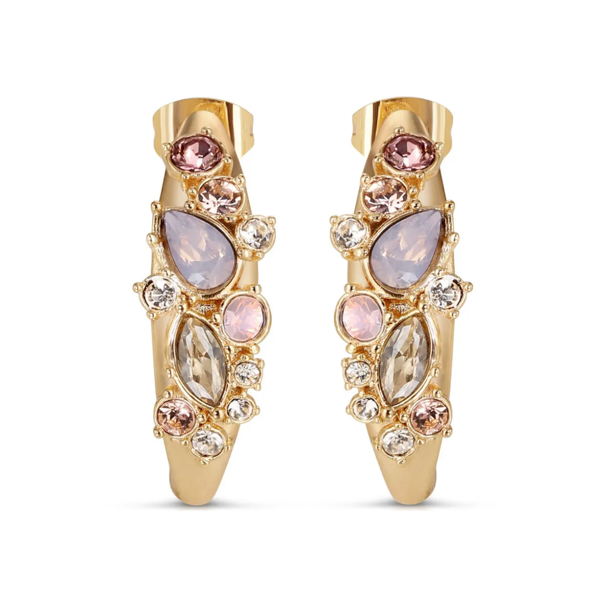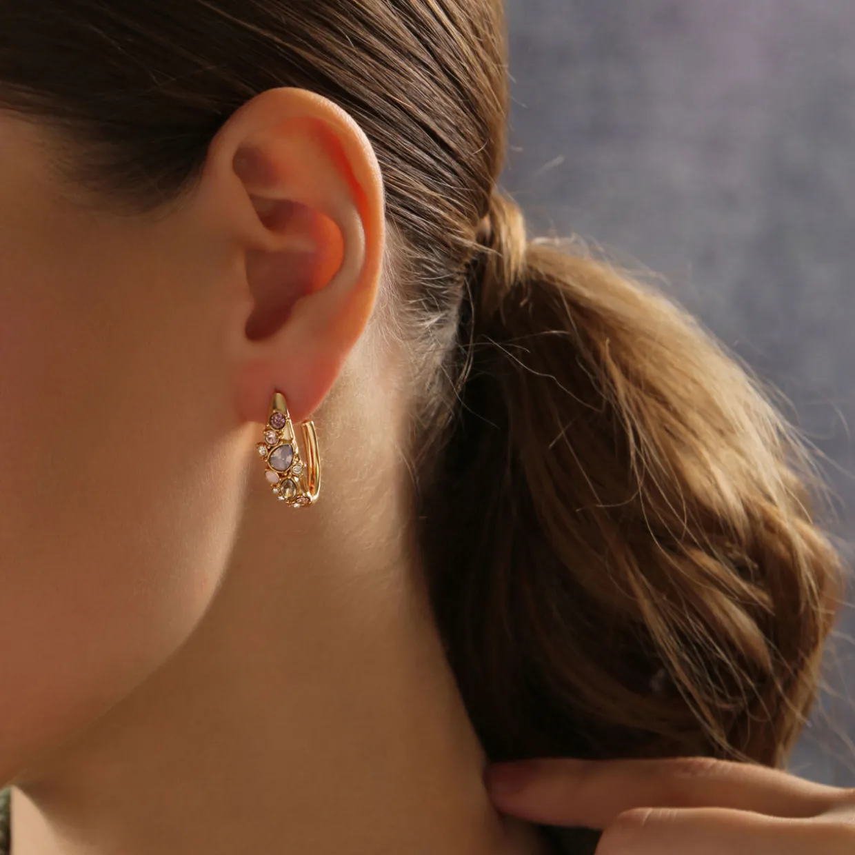 - 14kt gold-plated, protective anti-tarnish layer, coloured glass, crystal stone settings, unplated titanium posts, butterfly backs, gift box packaging