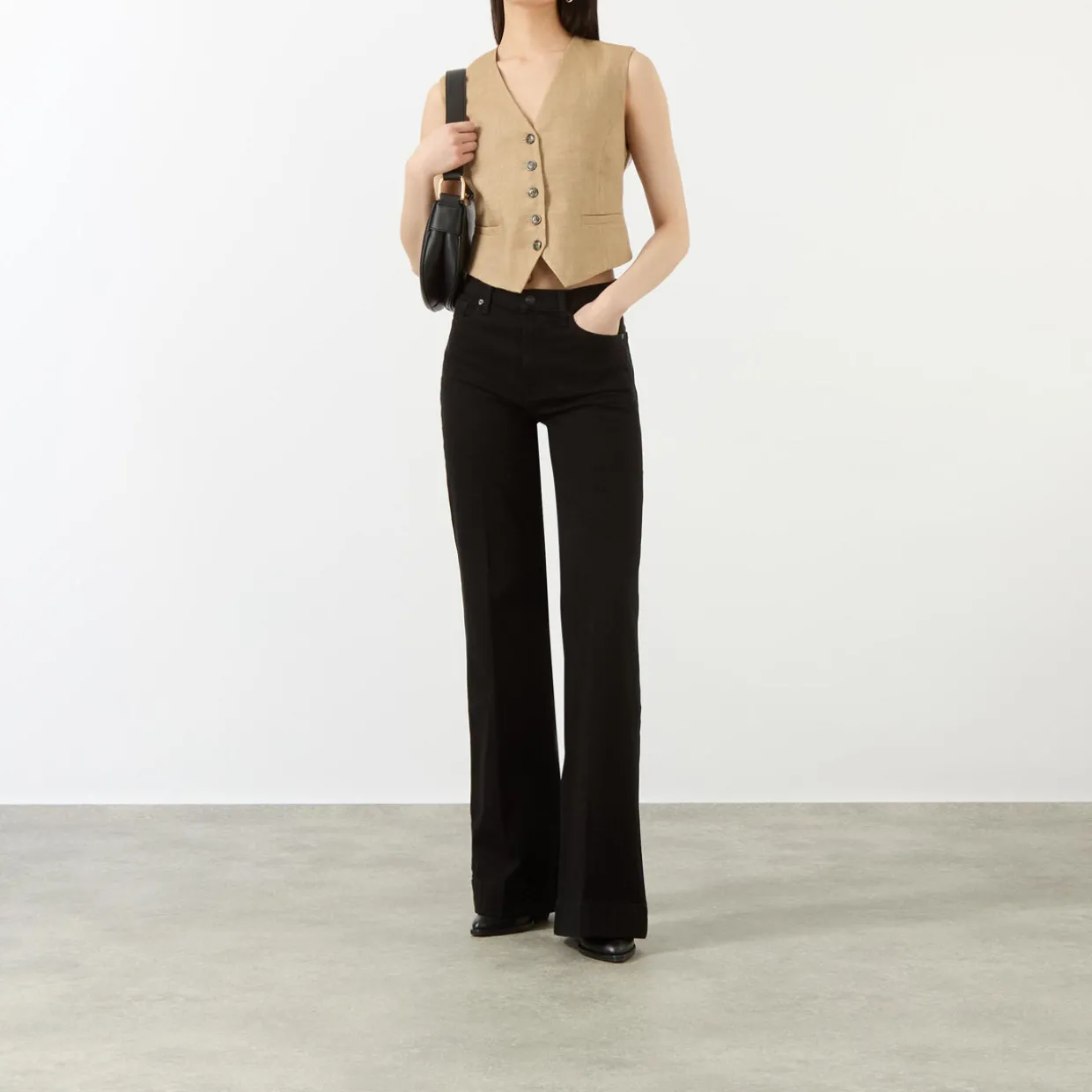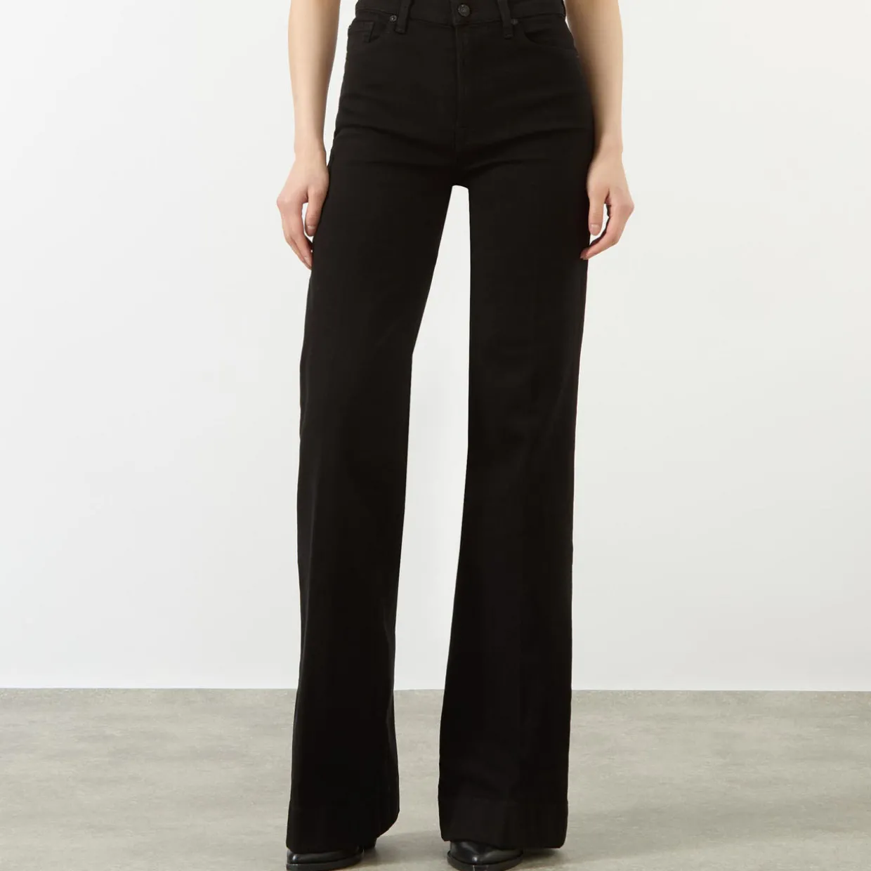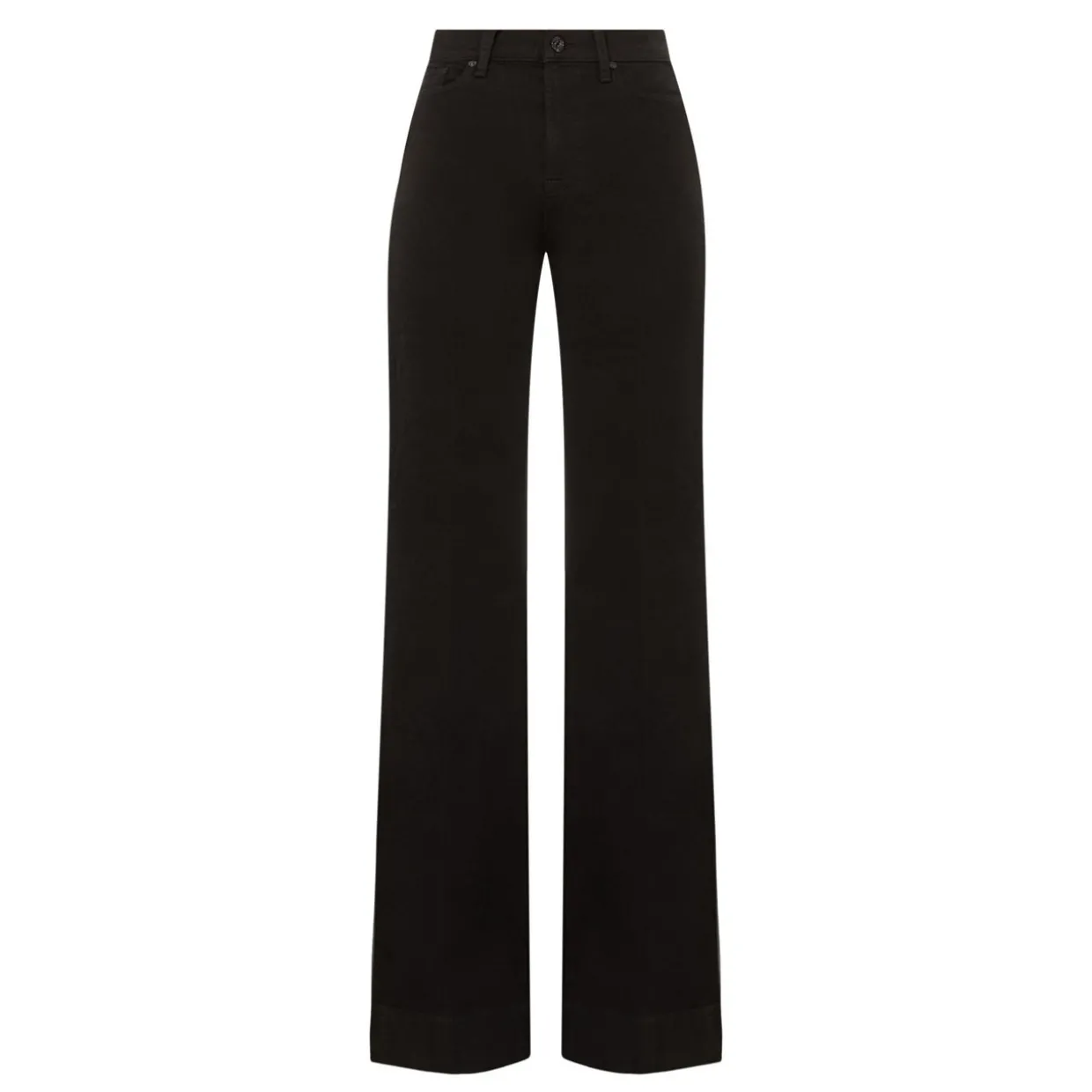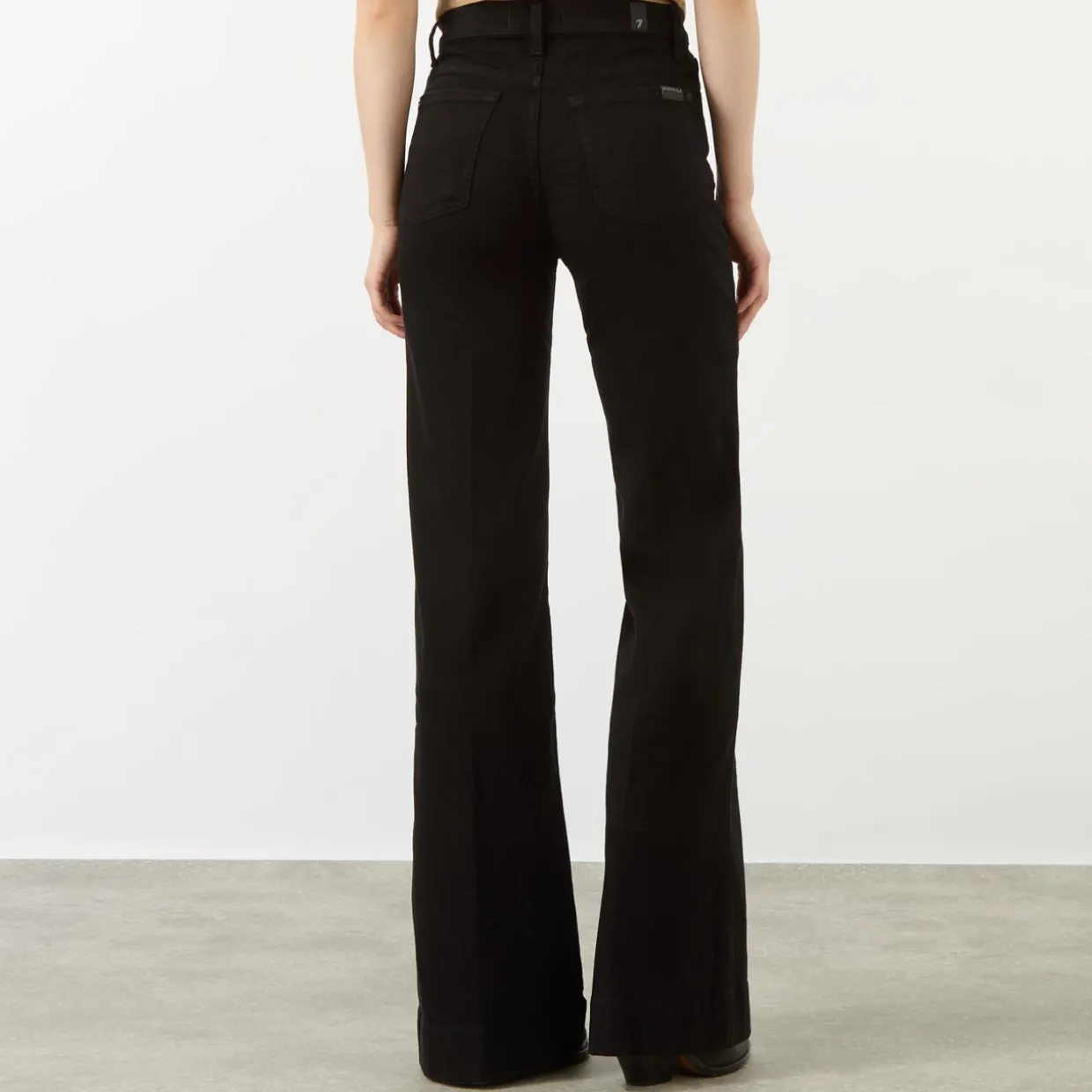 - High-waist, flared leg, zip fly and button fastening, belt loops, five-pocket design, contrast stitching, logo patch, smooth denim finish