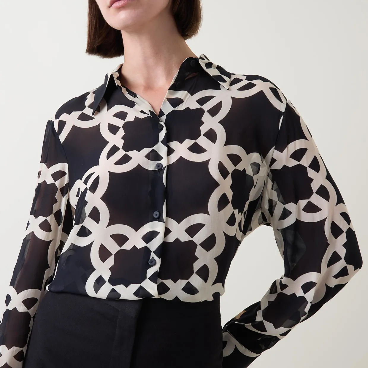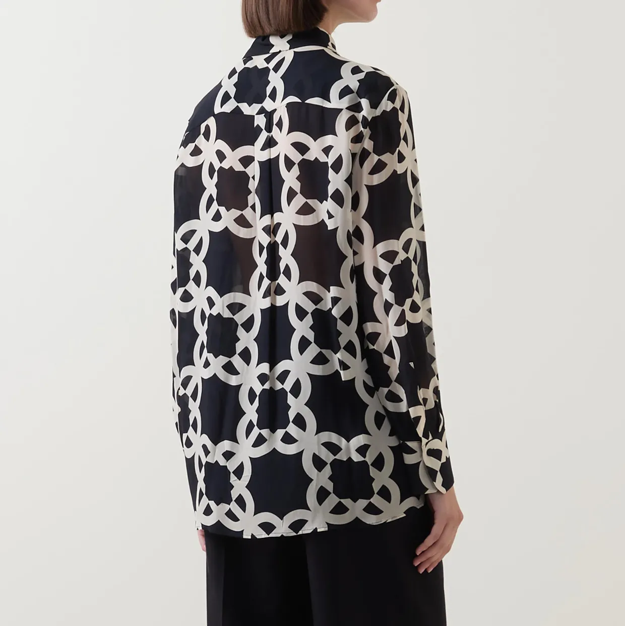 - Point collar, long sleeves, front button fastening, curved hem, monogram logo print, two-tone design, semi-sheer finish