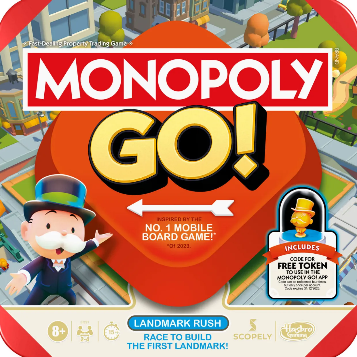 - Includes Portable Game Tray (with storage area and lid), 4 Double-Sided Mini Gameboards, 4 Tokens, 4 Dice (1 red, 1 yellow, 1 green, 1 blue), 40 Plastic Landmark Blocks (5 brown, 5 light blue, 5 pink, 5 orange, 5 red, 5 yellow, 5 green, 5 dark blue), 10 Chance Tiles, 4 Plastic Mr. Monopoly Markers, 2 Cardboard Bank Heist Dials (with plastic fasteners), and 4 Reference Cards. For 2 to 4 players