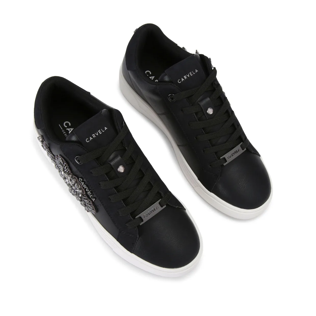 - Low-top style, faux leather, branded details, floral jewel patch
