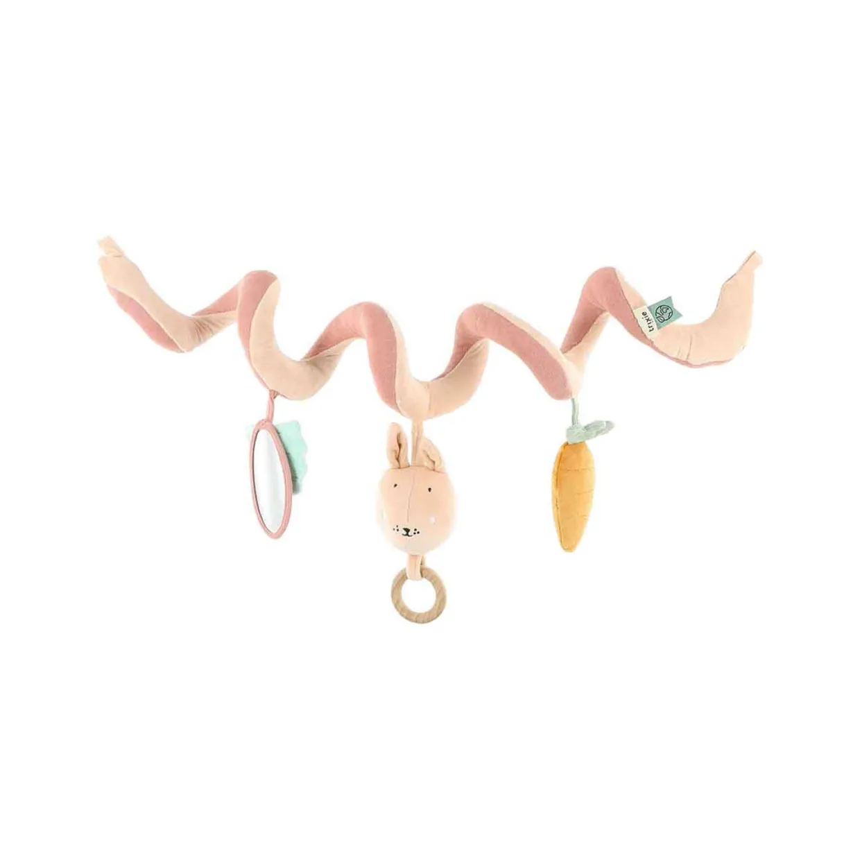 - Mrs. Rabbit design, one activity spiral, three activity elements, wooden ring, mirror, curls around any baby carrier or playpen, elements can be taken off to continue play