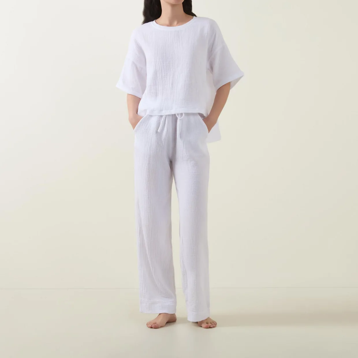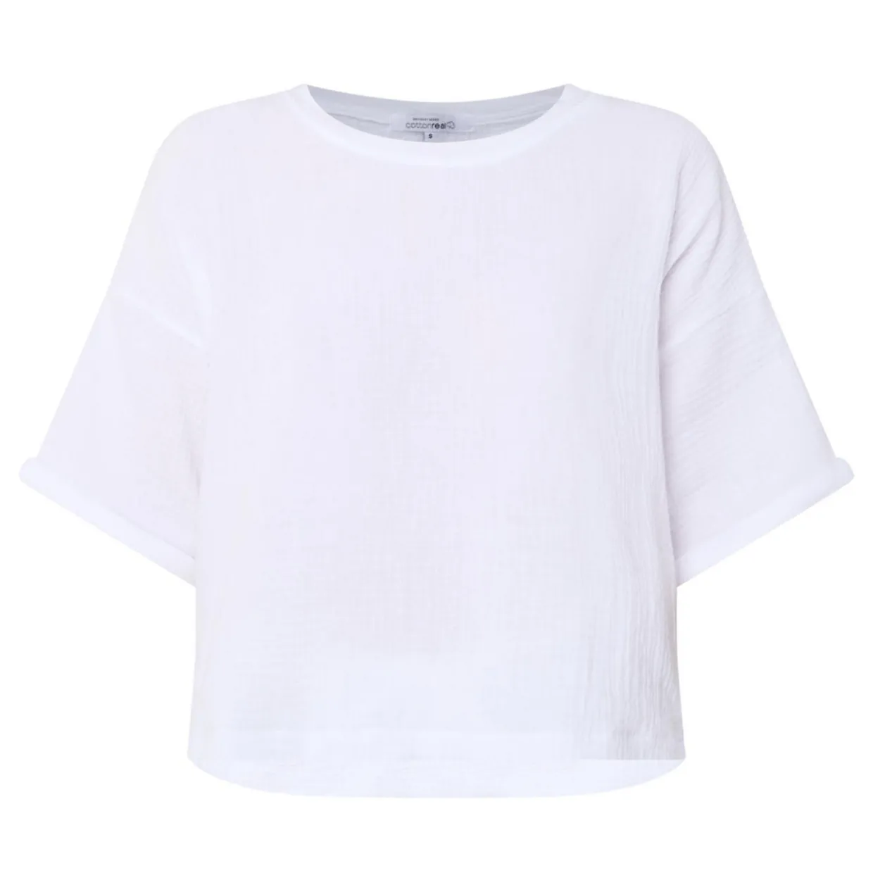 - Mid-length sleeves, round neckline, dropped shoulders, tonal stitching, textured finish